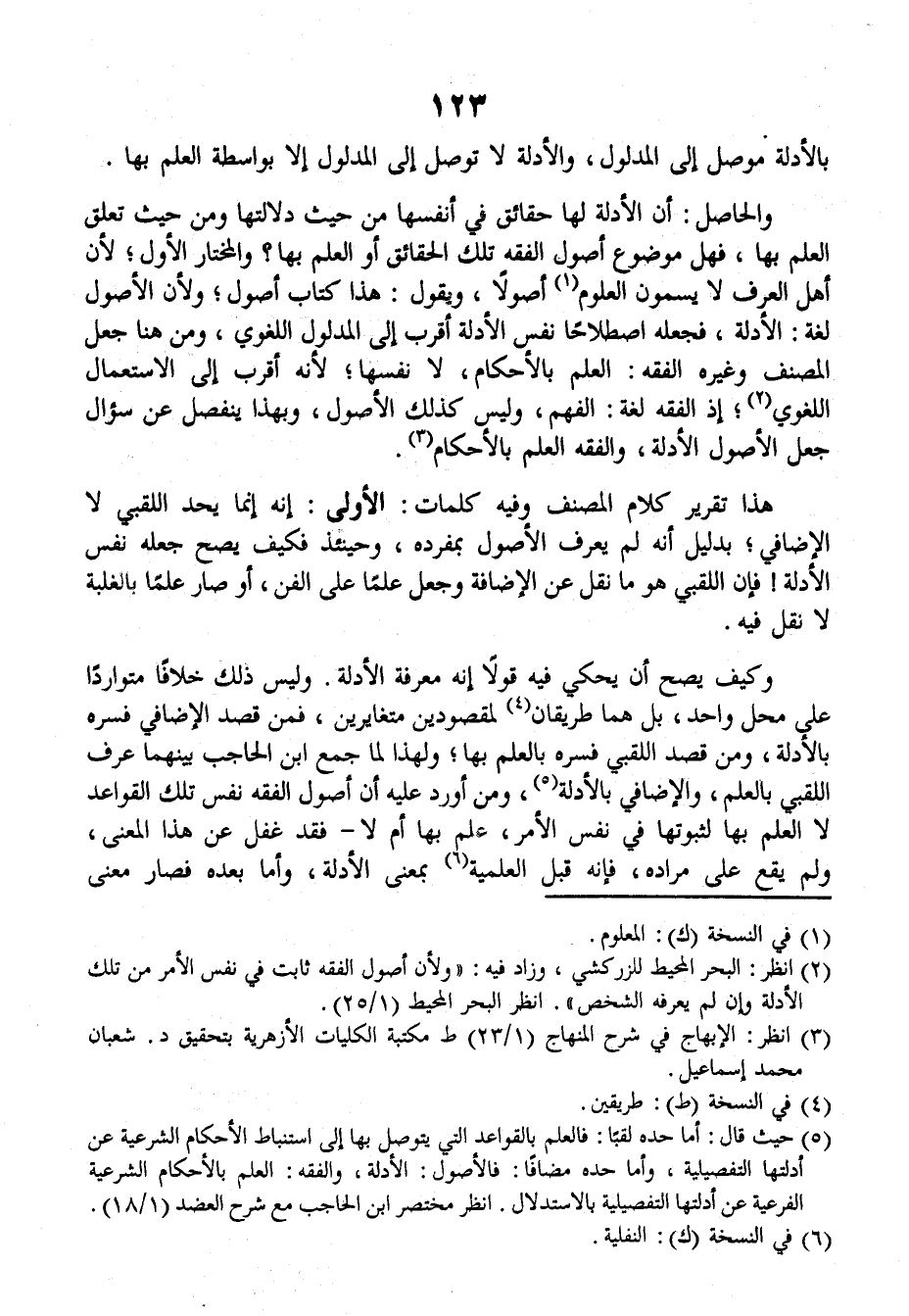 والحاصلُ: أنَّ الأدِلَّةَ لها حقائِقُ في أَنْفُسِها من حيثُ دَلاَلَتُها، ومِن حيثُ تَعَلُّقُ العِلْمِ بها، فهل موضوعُ أصولِ الفقهِ تلكَ الحقائقُ أو العِلْمُ بها؟ والمختارُ الأوَّلُ؛ لأنَّ أهلَ العُرْفِ لا يُسَمُّونَ العلومَ أُصُولاً، ويقولُ: هذا كتابُ أُصُولٍ، ولأنَّ الأصولَ لُغَةً: الأدِلَّةُ، فجَعْلُه اصطلاحاً نفسَ الأدِلَّةِ أقربُ إلى المدلولِ اللُّغَوِيِّ، ومِن هنا جَعَلَ المصنِّفُ وغيرُه الفِقْهَ: العلمَ بالأحكامِ، لا نَفْسَها؛ لأنَّه أقربُ إلى الاستعمالِ اللُّغَوِيِّ؛ إذ الفِقْهُ لغةً: الفَهْمُ، وليسَ كذلك الأصولُ، وبهذا يَنْفَصِلُ عن سؤالِ جَعْلِ الأصولِ الأدِلَّةَ، والفِقْهِ العِلْمَ بالأحكامِ.