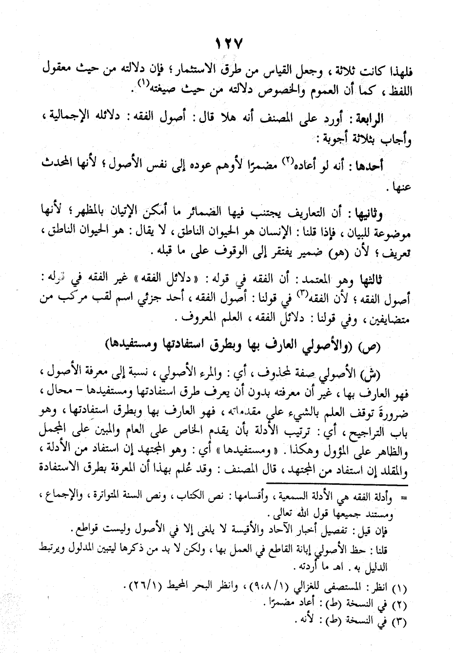 ثالثُها، وهو المُعْتَمَدُ: أنَّ الفِقْهَ في قَوْلِهِ: (دلائلُ الفقهِ) غيرُ الفقهِ في قَوْلِهِ: أصولُ الفقهِ؛ لأنَّ الفقهَ في قولِنا: أصولُ الفقهِ. أحدُ جُزْئَيِ اسمِ لَقَبٍ مُرَكَّبٍ مِن مُتَضَايِفَيْنِ، وفي قولِنا: دلائلُ الفقهِ العَلَمُ المعروفُ.