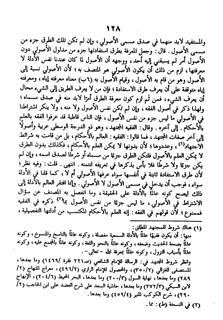 وقالَ: الفقيهُ: المُجْتَهِدُ، وهو ذو الدرجةِ الوُسْطَى عربِيَّةً وأُصُولاً. إلى آخِرِ صِفاتِ المجتهِدِ، فما قالُوا: الفقيهُ: العالِمُ بالأحكامِ، بل: مَن قَامَتْ به شرائطُ الاجتهادِ، وعَدَّدُوها؛ لأنَّ بِدُونِها لا يُمْكِنُ العلمُ بالأحكامِ، فكذلك بدونِ الطرقِ لا يُمْكِنُ العلمُ بالأصولِ، فلْتَكُنِ الطرُقُ جُزْءاً من مُسَمَّاهُ أو شَرْطاً لِصِدْقِ اسْمِهِ، وإنْ لم يَكُنْ جُزْءاً ولا شَرْطاً فلا بأسَ بِذِكْرِها في تعريفِهِ؛ لِتَتِمَّتِهِ. انْتَهَى.