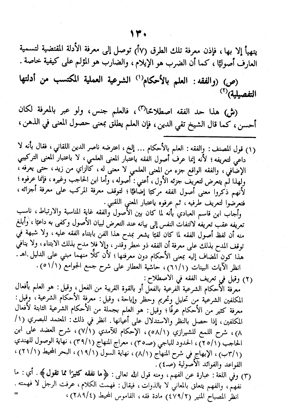 ش: هذا حَدُّ الفِقْهِ اصْطِلاحاً، فالعِلْمُ جِنْسٌ، ولو عَبَّرَ بالمعرفةِ لكانَ أحسنَ، كما قالَ الشيخُ تَقِيُّ الدينِ؛ فإنَّ العلمَ يُطْلَقُ بمعنى حصولِ المعنَى في الذهنِ،