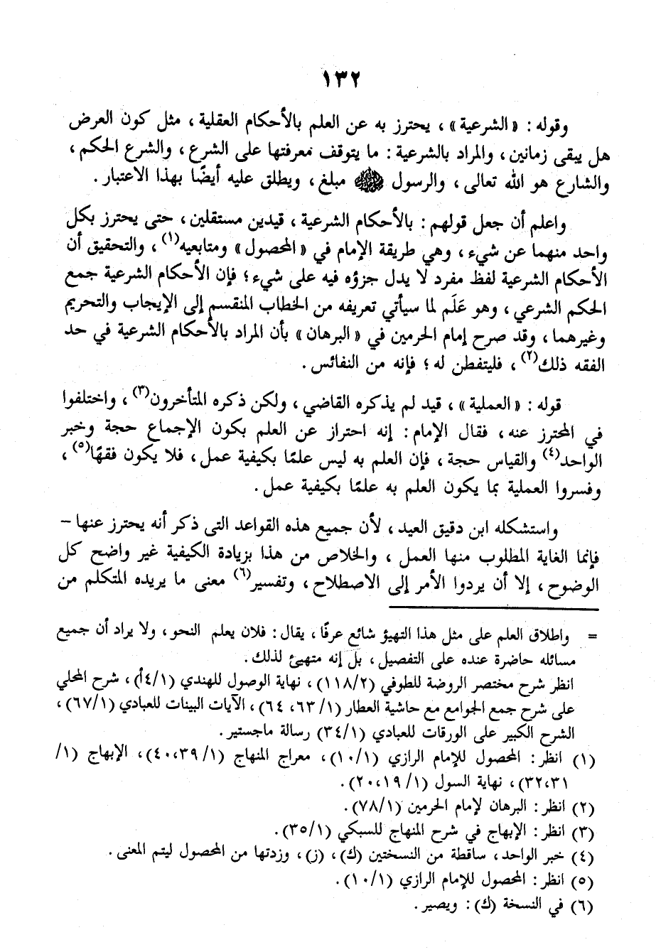 وقولُه: (الشرعيَّةِ) يُحْتَرَزُ به عن العلمِ بالأحكامِ العقليَّةِ، مثلُ كونِ العَرَضِ هل يَبْقَى زَمَانَيْنِ، والمرادُ بالشرعيَّةِ ما يَتَوَقَّفُ مَعْرِفَتُها على الشرعِ، والشرعُ: الحُكْمُ، والشارِعُ هو اللهُ تعالَى. والرسولُ صَلَّى اللهُ عَلَيْهِ وَسَلَّمَ مُبَلِّغٌ، ويُطْلَقُ عليه أيضاًً بهذا الاعتبارِ.