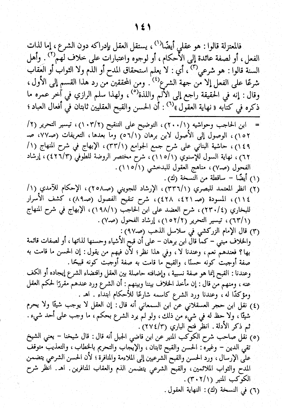 ومِن المُحَقِّقِينَ مَن رَدَّ هذا القِسْمَ إلى الأوَّلِ، وقالَ: إنَّه في الحقيقةِ راجِعٌ إلى الألَمِ واللَّذَّةِ؛ ولهذا سَلَّمَ الرَّازِيُّ في آخِرِ عُمُرِهِ ما ذَكَرَه في كِتَابِهِ (نِهَايَةِ العقولِ): أنَّ الحُسْنَ والقُبْحَ العَقْلِيَّيْنِ ثابتانِ في أفعالِ العبادِ؛