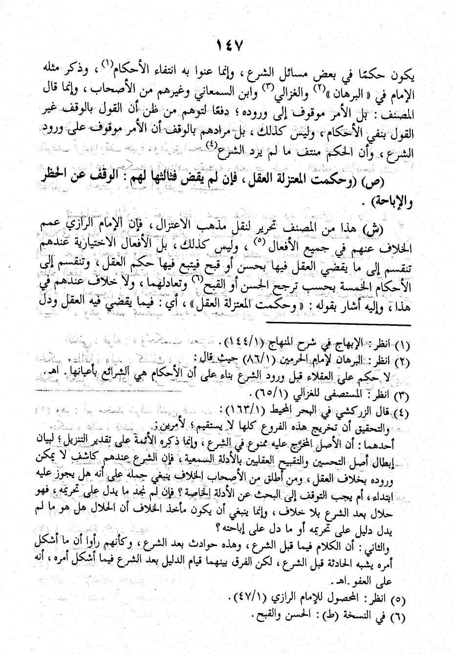 ش: هذا من المصنِّفِ تحريرٌ لنقلِ مذهبِ الاعتزالِ؛ فإنَّ الإمامَ الرَّازِيَّ عَمَّمَ الخلافَ عنهم في جميعِ الأفعالِ، وليسَ كذلك، بل الأفعالُ الاختياريَّةُ عندَهم تَنْقَسِمُ إلى ما يَقْضِي العقلُ فيها بِحُسْنٍ أو قُبْحٍ، فيُتَّبَعُ فيها حُكْمُ العقلِ، وتَنْقَسِمُ إلى الأحكامِ الخمسةِ بِحَسَبِ تَرَجُّحِ الحُسْنِ أو القُبْحِ وتَعَادُلِهِما، ولا خِلافَ عندَهم في هذا، وإليه أشارَ بقولِهِ: (وحَكَّمَتِ المُعْتَزِلَةُ العقلَ)؛ أي: فيما يَقْضِي فيه العقلُ، ودَلَّ