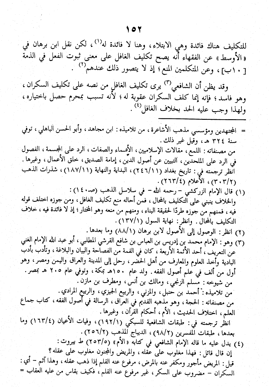 وقد يُظَنُّ أنَّ الشافعيَّ يَرَى تكليفَ الغافلِ مِن نَصِّهِ على تكليفِ السَّكْرَانِ، وهو فاسدٌ؛ فإنَّه إنما كَلَّفَ السكرانَ عُقُوبَةً له؛ لأنَّه تَسَبَّبَ بِمُحَرَّمٍ حَصَلَ باختيارِهِ؛ ولهذا وَجَبَ عليه الحَدُّ، بخلافِ الغافِلِ.