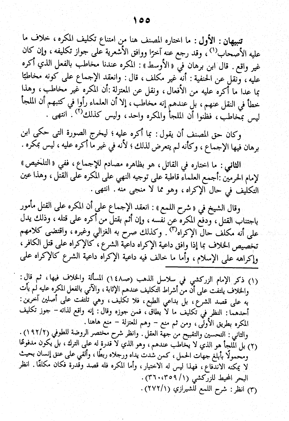 الأولُ: مَا اخْتَارَهُ المُصَنِّفُ هُنَا مِنَ امْتِنَاعِ تَكْلِيفِ الْمُكْرَهِ، خِلاَفَ مَا عَلَيْهِ الأصحابُ، وَقَدْ رَجَعَ عَنْهُ آخِراً وَوَافَقَ الأَشْعَرِيَّةَ عَلَى جَوَازِ تَكْلِيفِهِ، وَإِنْ كَانَ غَيْرَ وَاقِعٍ.