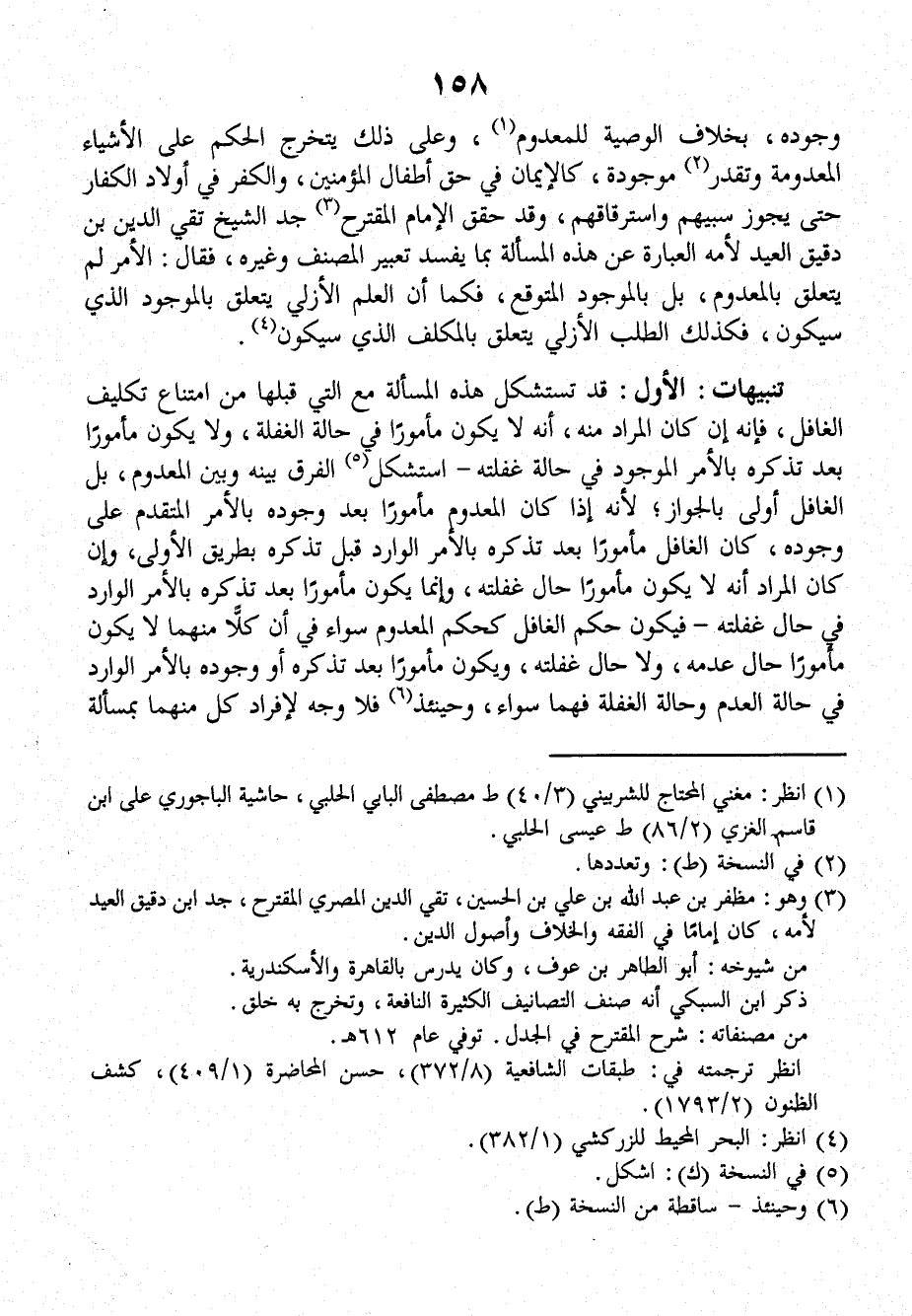 وُجُودِهِ، بِخِلاَفِ الوصيةِ للمعدومِ، وَعَلَى ذَلِكَ يَتَخَرَّجُ الحُكْمُ عَلَى الأشياءَ المعدومةِ وَتُقَدَّرُ مَوْجُودَةً، كالإيمانِ فِي حَقِّ أطفالِ المؤمنينَ، وَالْكُفْرِ فِي أولادِ الكُفَّارِ؛ حتى يَجُوزُ سَبْيُهُمْ وَاسْتِرْقَاقُهُمْ، وَقَدْ حَقَّقَ الإمامُ الْمُقْتَرِحُ ـ جَدِّ الشيخِ تَقِيِّ الدينِ بْنِ دَقِيقِ العِيدِ لأُمِّهِ ـ العبارةَ عَنْ هَذِهِ المسألةِ بِمَا يُفْسِدُ تعبيرَ الْمُصَنِّفِ وَغَيْرِهِ فَقَالَ: الأمرُ لَمْ يُتَعَقَّلْ بالمعدومِ، بَلْ بالموجودِ المُتَوَقَّعِ، فكما أَنَّ العِلْمَ الأَزَلِيَّ يَتَعَلَّقُ بالموجودِ الذِي سَيَكُونُ، فَكَذَلِكَ الطلبُ الأَزَلِيُّ يُتَعَقَّلُ بِالْمُكَلَّفِ الذِي سَيَكُونُ.