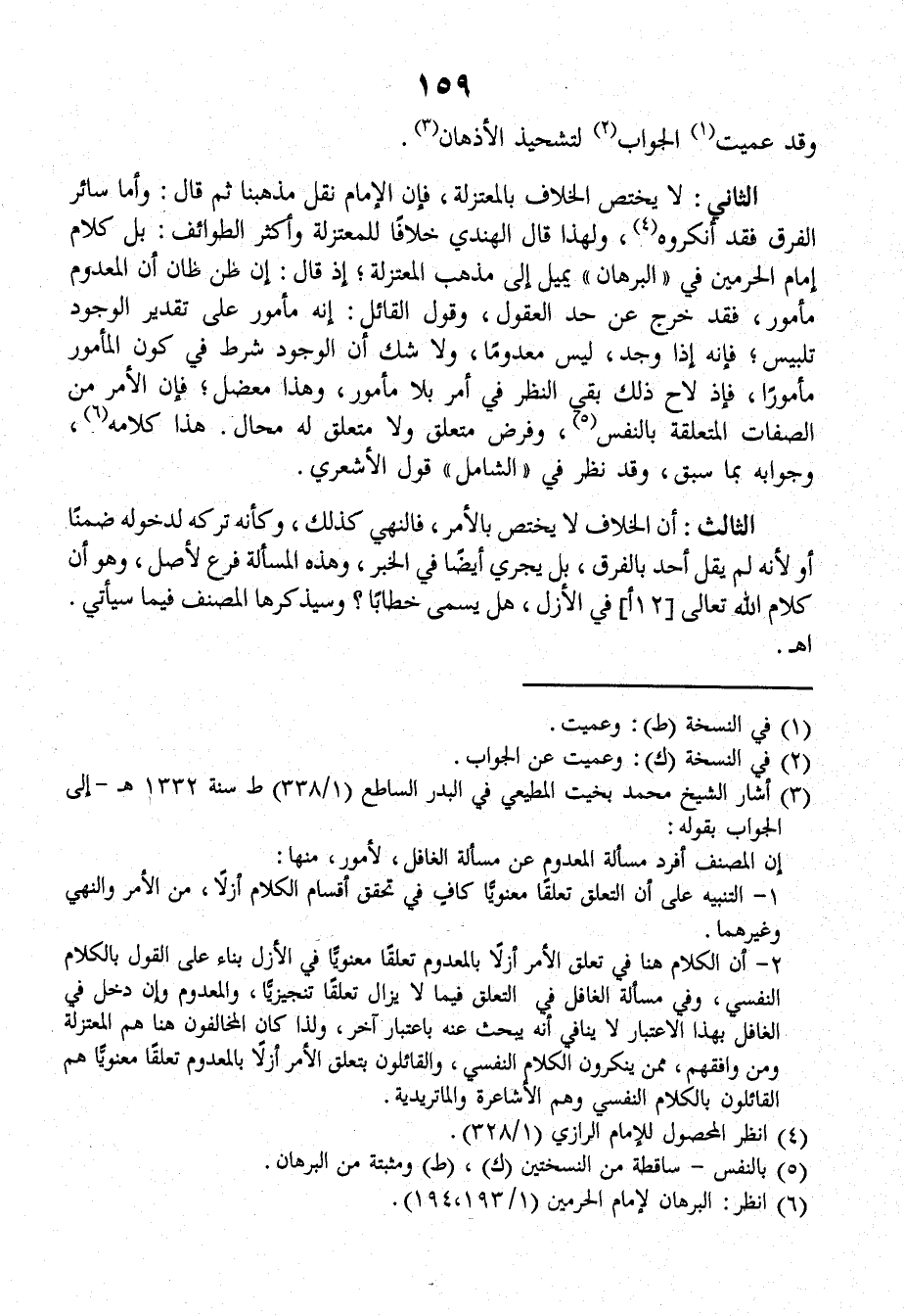 الثَّانِي: لاَ يَخْتَصُّ الخلافُ بالمعتزلةِ، فَإِنَّ الإمامَ نَقَلَ مذهبَنَا ثُمَّ قَالَ: وَأَمَّا سَائِرُ الفِرَقِ فَقَدْ أَنْكَرُوهُ، وَلِهَذَا قَالَ الْهِنْدِيُّ ـ خِلاَفاً للمعتزلةِ وأكثرِ الطوائفِ؛ بَلْ كلامُ إِمَامِ الحرمينِ فِي (الْبُرْهَانِ) يَمِيلُ إِلَى مَذْهَبِ المعتزلةِ؛ إِذْ قَالَ ـ: إِنْ ظَنَّ ظَانٌّ أَنَّ المعدومَ مأمورٌ، فَقَدْ خَرَجَ عَنْ حَدِّ [المعقولِ] =، وقولُ القائلِ: إِنَّهُ مأمورٌ عَلَى تقديرِ الوجودِ تلبيسٌ، فَإِنَّهُ إِذَا وُجِدَ لَيْسَ معدوماً، ولاَ شَكَّ أَنَّ الْوُجُودَ شرطٌ فِي كَوْنِ المأمورِ مأموراً، فَإِذَا لاَحَ ذَلِكَ بَقِيَ النظرُ فِي أَمْرٍ بِلاَ مأمورٍ، وَهَذَا مُعْضِلٌ فَإِنَّ الأَمْرَ مِنَ الصفاتِ الْمُتَعَلِّقَةِ بالنفسِ، وفرضُ مُتَعَلِّقٍ ولاَ مُتَعَلَّقَ لَهُ مُحَالٌ.
