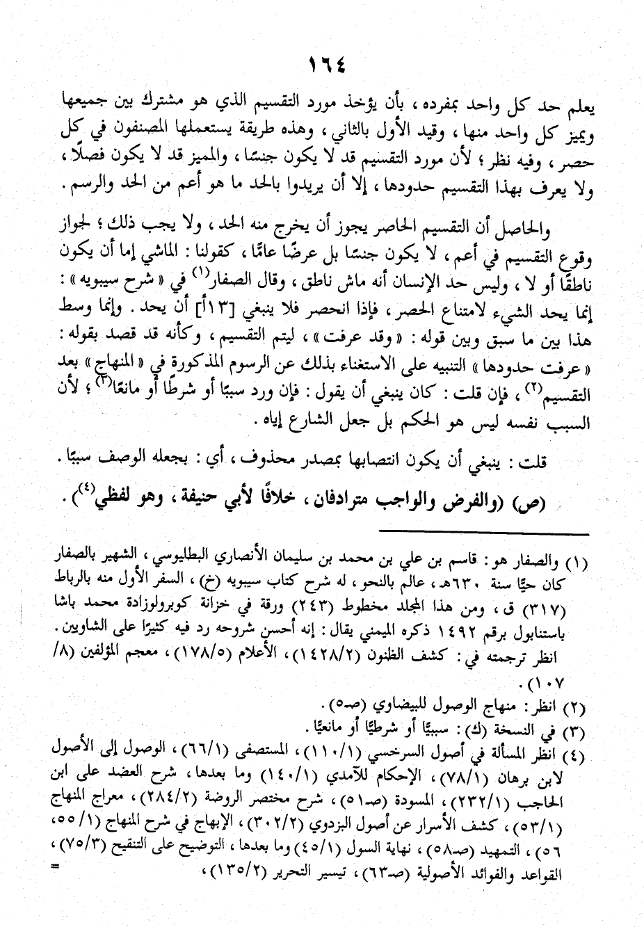 وَقَالَ الصَّفَّارُ فِي (شَرْحِ سِيبَوَيْهِ): إِنَّمَا يُحَدُّ الشيءُ لامْتِنَاعِ الحصرِ، فَإِذَا انْحَصَرَ فَلاَ يَنْبَغِي (٣ أ) أَنْ يُحَدَّ، وَإِنَّمَا وُسِّطَ هَذَا بَيْنَ مَا سَبَقَ وَبَيْنَ قَوْلِهِ: (وَقَدْ عُرِفَتْ) لِيَتِمَّ التقسيمُ، وَكَأَنَّهُ قَدْ قَصَدَ بقولِهِ: (عُرِفَتْ حُدُودُهَا) التنبيهَ عَلَى الاستغناءِ بِذَلِكَ عَنِ الرسومِ المذكورةِ فِي (الْمِنْهَاجِ) بَعْدَ التقسيمِ.