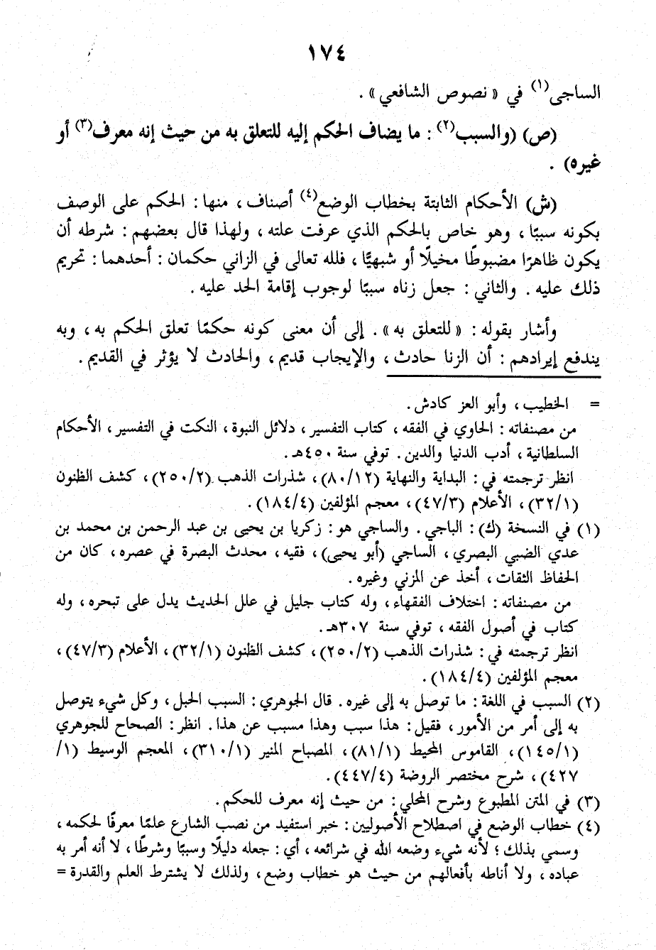 (ش): الأحكامُ الثابتةُ بخطابِ الوضعِ أصنافٌ، منها: الْحُكْمُ عَلَى الوصفِ بِكَوْنِهِ سَبَباً، وهو خَاصٌّ بِالحُكْمِ الذي عُرِفَتْ عِلَّتُهُ، وَلِهَذَا قَالَ بَعْضُهُمْ: شَرْطُهُ أَنْ يَكُونَ ظَاهِراً مَضْبُوطاً مُخَيَّلاً أَوْ شَبَهِيًّا؛ فُلَلَّهِ تَعَالَى في الزَّانِي حُكْمَانِ: أَحَدُهُمَا: تَحْرِيمُ ذَلِكَ عليه، والثانِي: جَعْلُ زِنَاهُ سَبَباً لِوُجُوبِ إِقَامَةِ الْحَدِّ عَلَيْهِ.
