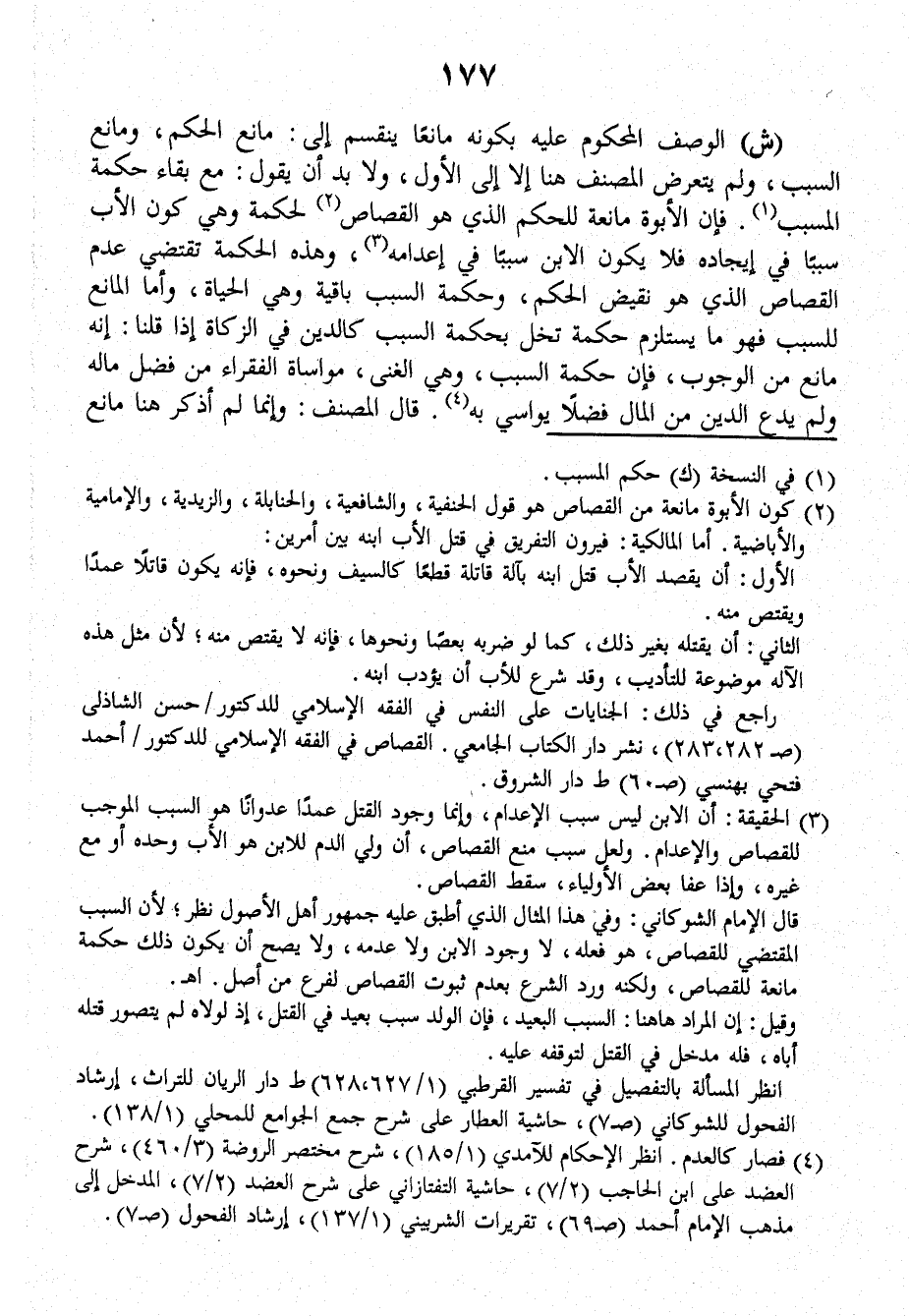 (ش): الوصفُ المحكومُ عليه بِكَوْنِهِ مَانِعاً يَنْقَسِمُ إلى: مانعِ الحُكْمِ، ومانعِ السببِ، وَلَمْ يَتَعَرَّضْ الْمُصَنِّفُ هُنَا إِلاَّ إلى الأولِ، وَلاَ بُدَّ أَنْ يَقُولَ: مَعَ بَقَاءِ حِكْمَةِ المُسَبِّبِ، فَإِنَّ الأبوةَ مانعةٌ للحُكْمِ الذِي هُوَ القِصَاصُ لِحِكْمَةٍ وهي كَوْنُ الأبِ سبباً فِي إِيجَادِهِ فَلاَ يَكُونُ الابْنُ سبباً في إِعْدَامِهِ، وهذه الحكمةُ تَقْتَضِي عَدَمَ القِصَاصِ الذِي هُوَ نقيضُ الحُكْمِ، وَحِكْمَةُ السببِ باقيةٌ وهي الحياةُ، وَأَمَّا المانعُ للسببِ فَهُوَ مَا يَسْتَلْزِمُ حِكْمَةً تُخِلُّ بحكمةِ السببِ كَالدَّيْنِ في الزكاةِ إِذَا قُلْنَا: إِنَّهُ مانعٌ مِنَ الوجوبِ، فَإِنَّ حِكْمَةَ السببِ، وهي الغِنَى، مواساةُ الفقراءِ مِنْ فَضْلِ مَالِهِ، وَلَمْ يَدَعِ الدَّيْنُ مِنَ المالِ فَضْلاً يُواسِي بِهِ.