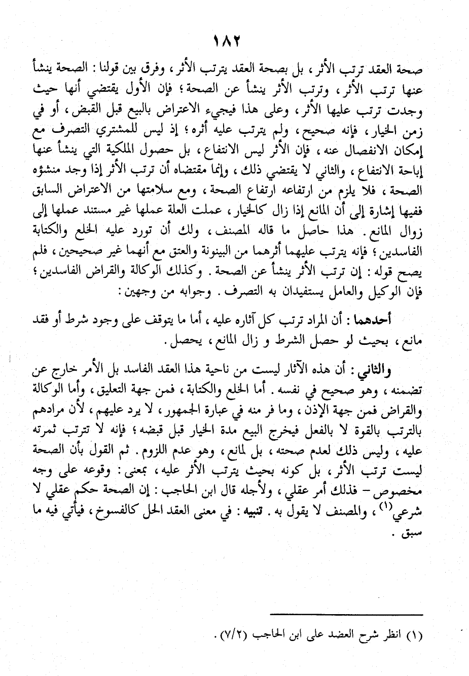 صحةَ العقدِ تَرَتُّبَ الأَثَرِ، بَلْ بصحةِ العقدِ يَتَرَتَّبُ الأَثَرُ، وَفَرَّقَ بَيْنَ قَوْلِنَا: الصحةُ يَنْشَأُ عَنْهَا تَرَتُّبُ الأَثَرِ، وَتَرَتُّبُ الأَثَرِ يَنْشَأُ عَنِ الصحةِ، فَإِنَّ الأولَ يَقْتَضِي أَنَّهَا حَيْثُ وُجِدَتْ تَرَتَّبَ عليهَا الأَثَرُ، وعلى هذا فَيَجِيءُ الاعتراضُ بالبيعِ قَبْلَ القبضِ، أَوْ فِي زَمَنِ الخيارِ، فَإِنَّهُ صحيحٌ، وَلَمْ يَتَرَتَّبْ عليه أَثَرُهُ، إِذْ لَيْسَ للمشترِي التصرفُ مَعَ إمكانِ الانفصالِ عَنْهُ، فَإِنَّ الأثرَ ليسَ الانتفاعُ، بَلْ حصولُ الملكيةِ التِي يَنْشَأُ عَنْهَا إباحةُ الانتفاعِ، والثانِي لاَ يَقْتَضِي ذَلِكَ، وَإِنَّمَا مُقْتَضَاهُ أَنَّ تَرَتُّبَ الأثرِ إِذَا وُجِدَ مَنْشَؤُهُ الصحةُ، فَلاَ يَلْزَمُ مِنِ ارتفاعِهِ ارتفاعُ الصحةِ، وَمَعَ سلامَتُهَا مِنَ الاعتراضِ السابقِ ففيها إشارةٌ إلى أَنَّ المانعَ إِذَا زَالَ