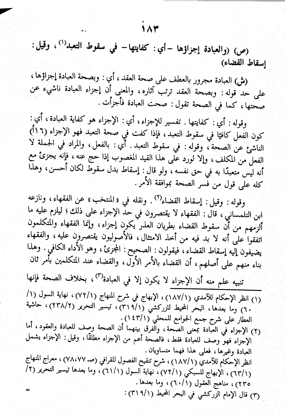 وَقَوْلُهُ: وَقِيلَ: إسقاطُ القضاءِ، وَنَقَلَهُ فِي (الْمُنْتَخَبِ) عَنِ الفقهاءِ، وَنَازَعَهُ ابْنُ التِّلْمِسَانِيِّ، قَالَ: الفقهاءُ لاَ يَقْتَصِرُونَ فِي حَدِّ الإِجْزَاءِ على ذلكَ، لِيَلْزَمَ عليه مَا أَلْزَمَهُمْ مِنْ أَنَّ سقوطَ القضاءِ بِطَرَيانِ+ العُذْرِ يَكُونُ إِجْزَاءً، وَإِنَّمَا الفقهاءُ والمتكلمُونَ اتَّفَقُوا عَلَى أَنَّهُ لاَ بُدَّ فيه مِنْ أَخْذِ الامتثالِ، فالأُصُولِيُّونَ يَقْتَصِرُونَ عليه، والفقهاءُ يُضِيفُونَ إليه إسقاطَ القضاءِ، فَيَقُولُونَ: الصحيحُ: المجزئُ وهو الأداءُ الكافِي، وَهَذَا بِنَاءً منهم على أَصْلِهِمْ، أَنَّ القضاءَ بالأمرِ الأولِ، والقضاءُ عِنْدَ المتكلمِينَ بأمرٍ ثانٍ.