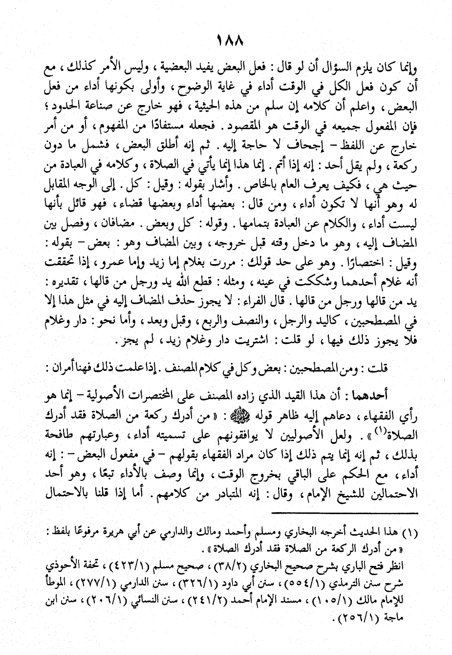 أَحَدُهُمَا: أَنَّ هَذَا القيدَ الذِي زَادَهُ الْمُصَنِّفُ على الْمُخْتَصَرَاتِ الأُصُولِيَّةِ ـ إِنَّمَا هُوَ رَايُ الفقهاءِ، دَعَاهُمْ إليهِ ظَاهِرُ قَوْلِهِ صَلَّى اللَّهُ عَلَيْهِ وَسَلَّمَ: ((مَنْ أَدْرَكَ رَكْعَةً مِنَ الصَّلاَةِ فَقَدْ أَدْرَكَ الصَّلاَةَ)) وَلَعَلَّ الأصوليينَ لاَ يُوَافِقُونَهُمْ على تسميتِهِ أَدَاءً، وعبارتُهُمْ طافحةٌ بِذَلِكَ، ثُمَّ إِنَّهُ إِنَّمَا يَتِّمُ ذَلِكَ إِذَا كَانَ مُرَادُ الفقهاءِ بقولِهِمْ ـ في مفعولِ البعضِ ـ إِنَّهُ أُدَاءٌ، مَعَ الْحُكْمِ عَلَى الباقِي بخروجِ الوقتِ، وَإِنَّمَا وُصِفَ بِالأَدَاءِ تَبَعاً، وهو أَحَدُ الاحتمالَيْنِ للشيخِ الإمامِ، وَقَالَ: إِنَّهُ المتبادرُ مِنْ كلامِهِمْ، أَمَّا إِذَا قُلْنَا بالاحتمالِ