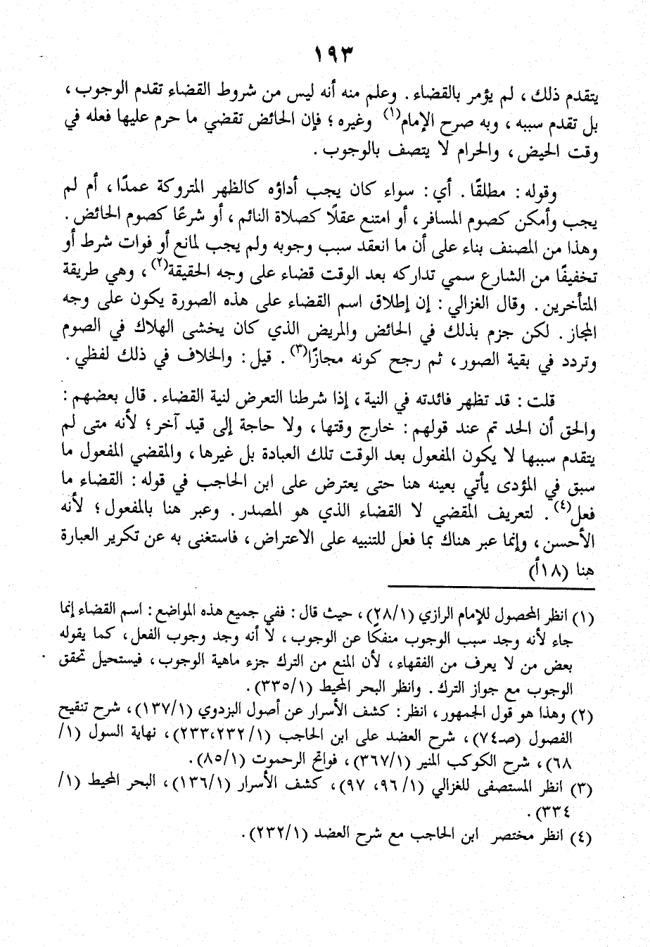 قُلْتُ: قَدْ تَظْهَرُ فائدتُهُ في النِّيَّةِ، إِذَا شَرَطْنَا التعرضَ لِنِيَّةِ القضاءِ، قَالَ بَعْضُهُمْ والحقُّ أَنَّ الْحَدَّ تَمَّ عِنْدَ قَوْلِهِمْ: خَارِجُ وَقْتِهَا، وَلاَ حَاجَةَ إلى قيدٍ آخَرَ؛ لأَنَّهُ مَتَى لَمْ يَتَقَدَّمْ سببُهَا لاَ يَكُونُ المفعولُ بَعْدَ الوقتِ تِلْكَ العبادةِ بَلْ غَيْرَهَا، ـ والمقضيُّ المفعولُ مَا سَبَقَ في المُؤَدَّى يَاتِي بِعَيْنِهِ هُنَا حَتَّى يَعْتَرِضَ عَلَى ابْنِ الحَاجِبِ فِي قَوْلِهِ: القضاءُ مَا فُعِلَ لتعريفِ الْمَقْضِيِّ لاَ القضاءُ الذِي هو المصدرُ، وَعَبَّرَ هُنَا بالمفعولِ لأَنَّهُ الأحسنُ وَإِنَّمَا عَبَّرَ هُنَاكَ بِمَا فُعِلَ للتنبيهِ على الاعتراضِ، فَاسْتَغْنَى بِهِ عَنْ تَكْرِيرِ العبارةِ هُنَا (١٨ أ).