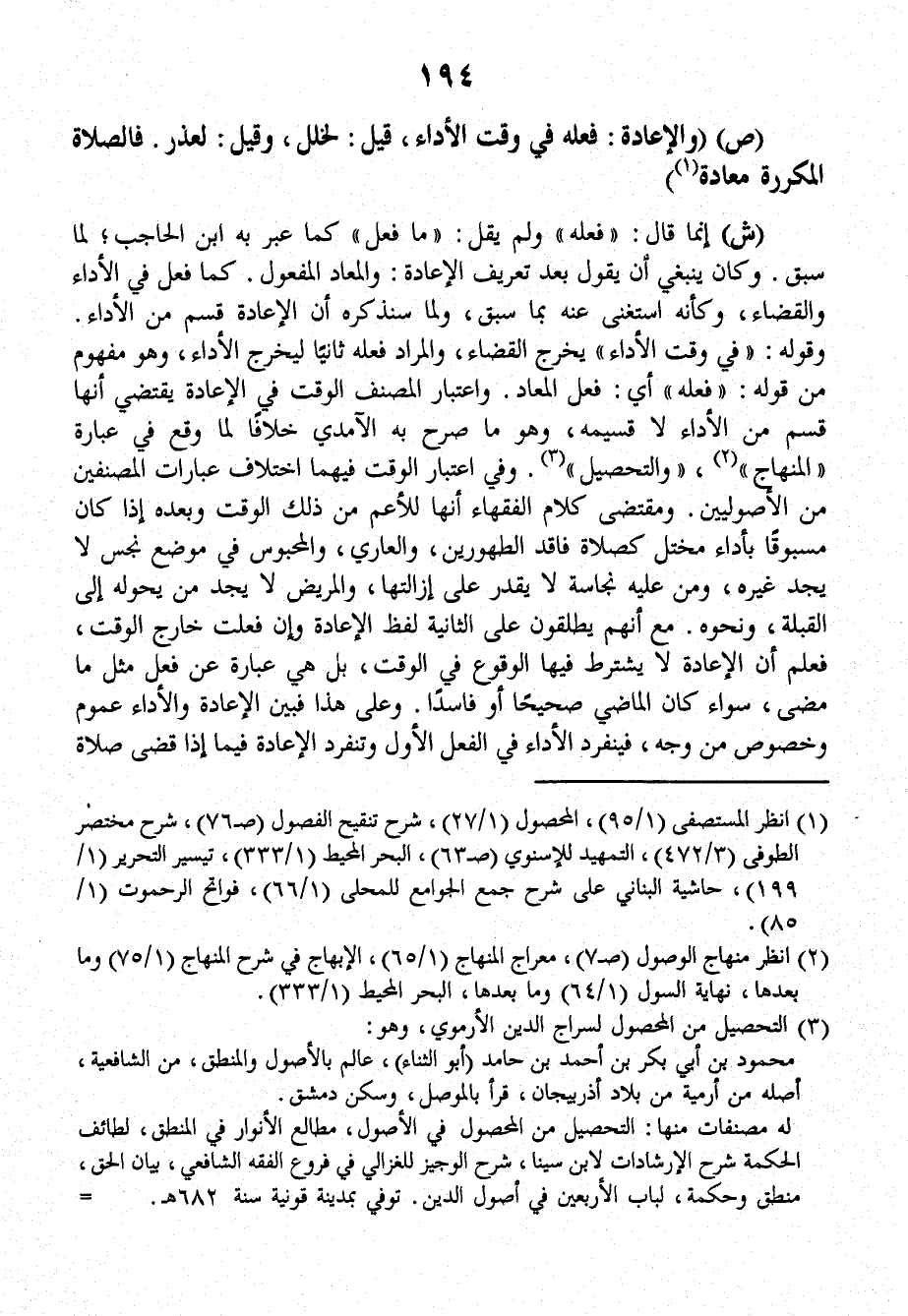 واعتبارُ الْمُصَنِّفِ الوقتَ في الإعادةِ يَقْتَضِي أَنَّهَا قِسْمٌ مِنَ الأداءِ لاَ قَسِيمُهُ، وَهُوَ مَا صَرَّحَ بِهِ الآمِدِيُّ خِلاَفاً لِمَا وَقَعَ فِي عبارةِ (الْمِنْهَاجِ) (وَالتَّحْصِيلِ).