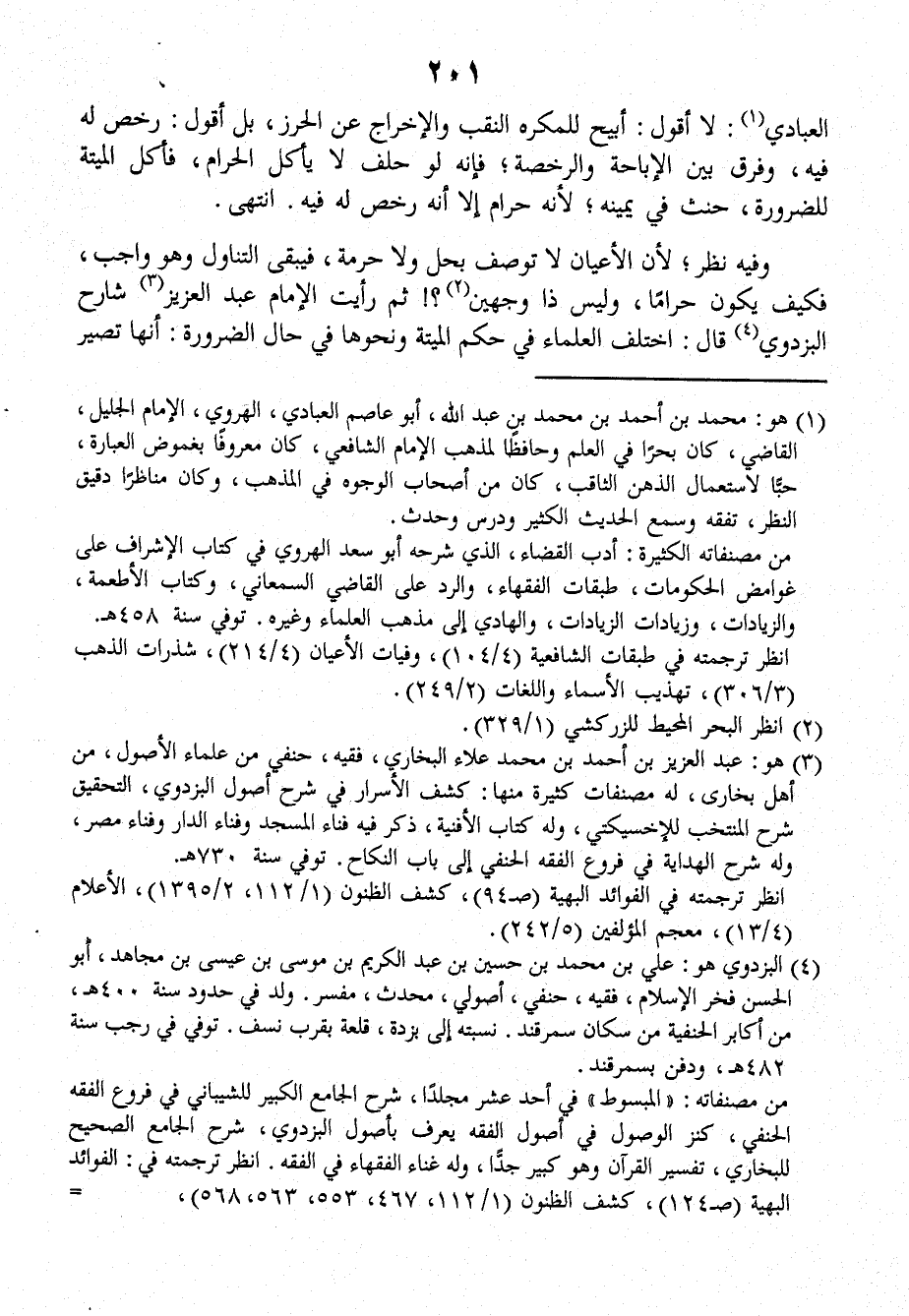 وَفِيهِ نَظَرٌ؛ لأَنَّ الأَعْيَانَ لاَ تُوصَفُ بِحِلٍّ وَلاَ حُرْمَةٍ، فَيَبْقَى التناولُ وهو واجبٌ، فيكفَ يَكُونُ حَرَاماً وليسَ ذَا وَجْهَينِ؟! ثُمَّ رَأَيْتُ الإِمَامَ عَبْدَ الْعَزِيزِ شَارِحَ البَزْدَوِيِّ قَالَ: اخْتَلَفَ الْعُلَمَاءُ فِي حُكْمِ الْمَيْتَةِ وَنَحْوِهَا فِي حَالِ الضرورةِ: أَنَّهَا تَصِيرُ