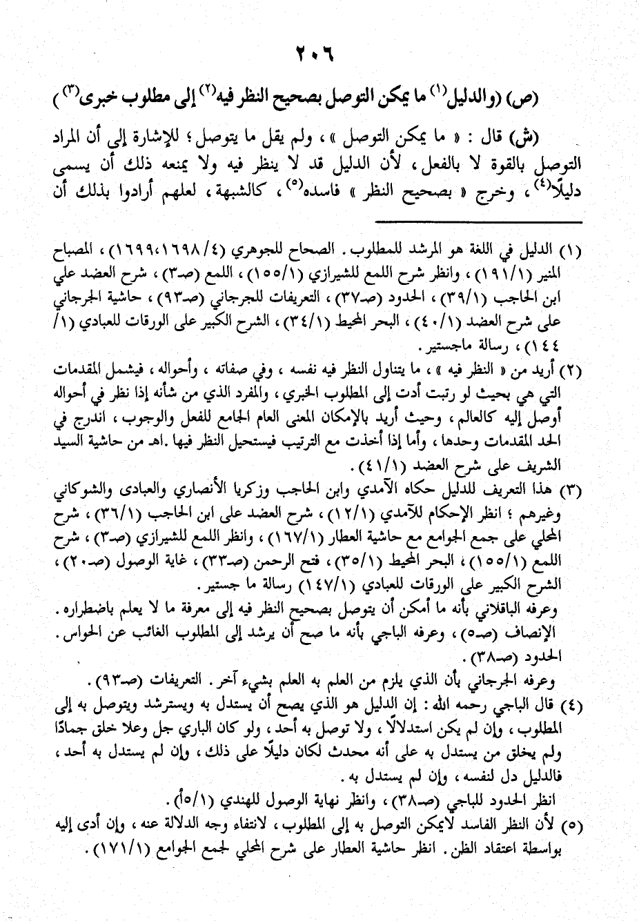 (ش): قَالَ: (مَا يُمْكِنُ التوصُّلُ) وَلَمْ يَقُلْ مَا يَتَوَصَّلُ للإشارةِ إلى أنَّ المرادَ التوصُّلُ بالقوةِ لاَ بالفعلِ؛ لأنَّ الدليلَ قَدْ لاَ يُنْظَرُ فيه، ولاَ يَمْنَعُهُ ذَلِكَ أَنْ يُسَمَّى دليلاً، وَخَرَجَ (بِصَحِيحِ النظرِ) فَاسِدُهُ، كالشبهةِ، لعلهم أَرَادُوا بِذَلِكَ أَنَّ