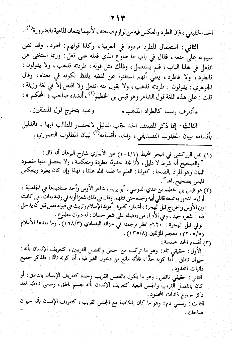 *أَتَعْرِفُ رَسْماً كَالطِّرَادِ المَذْهَبِ* ... وعليه يِتَخَرَّجُ قَوْلُ الْمَنْطِقِيِّينَ.