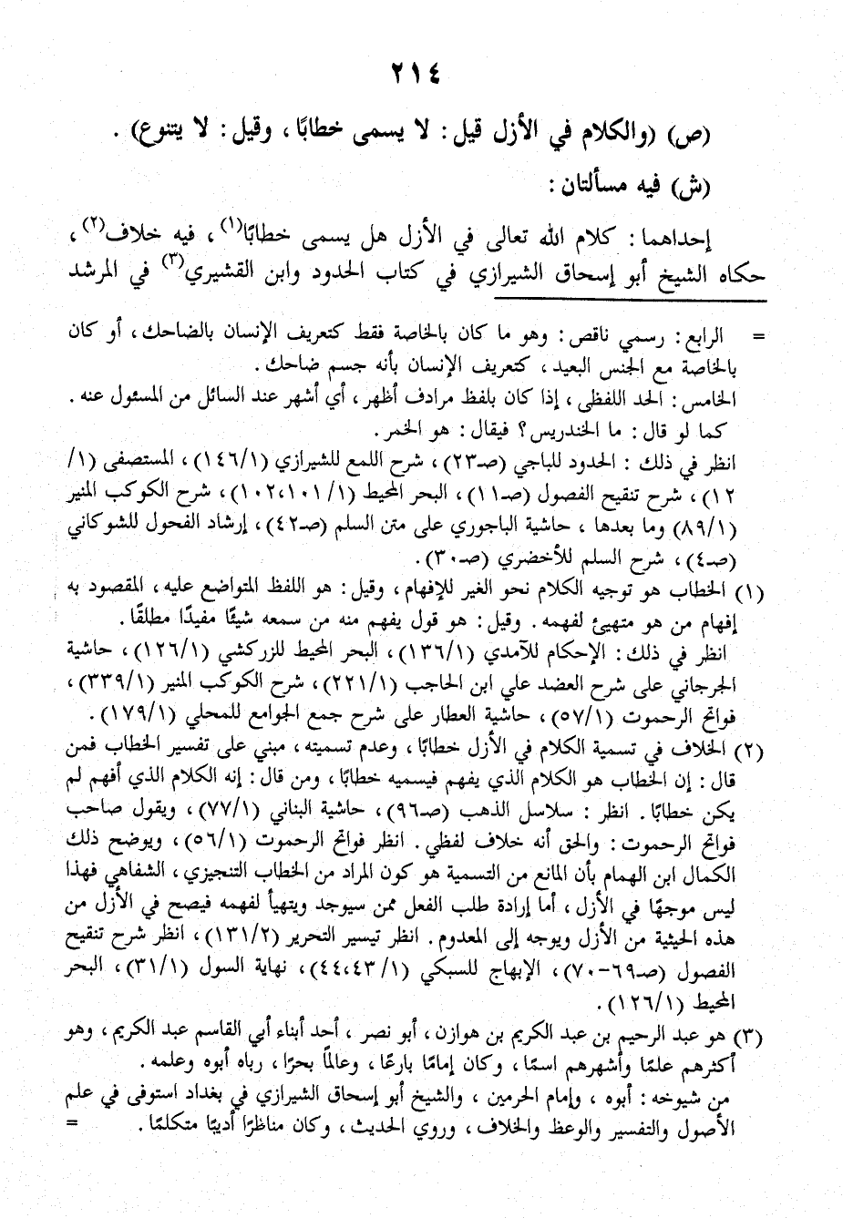 إِحْدَاهُمَا: كلامُ اللَّهِ تَعَالَى في الأَزَلِ هَلْ يُسَمَّى خِطَاباً؟