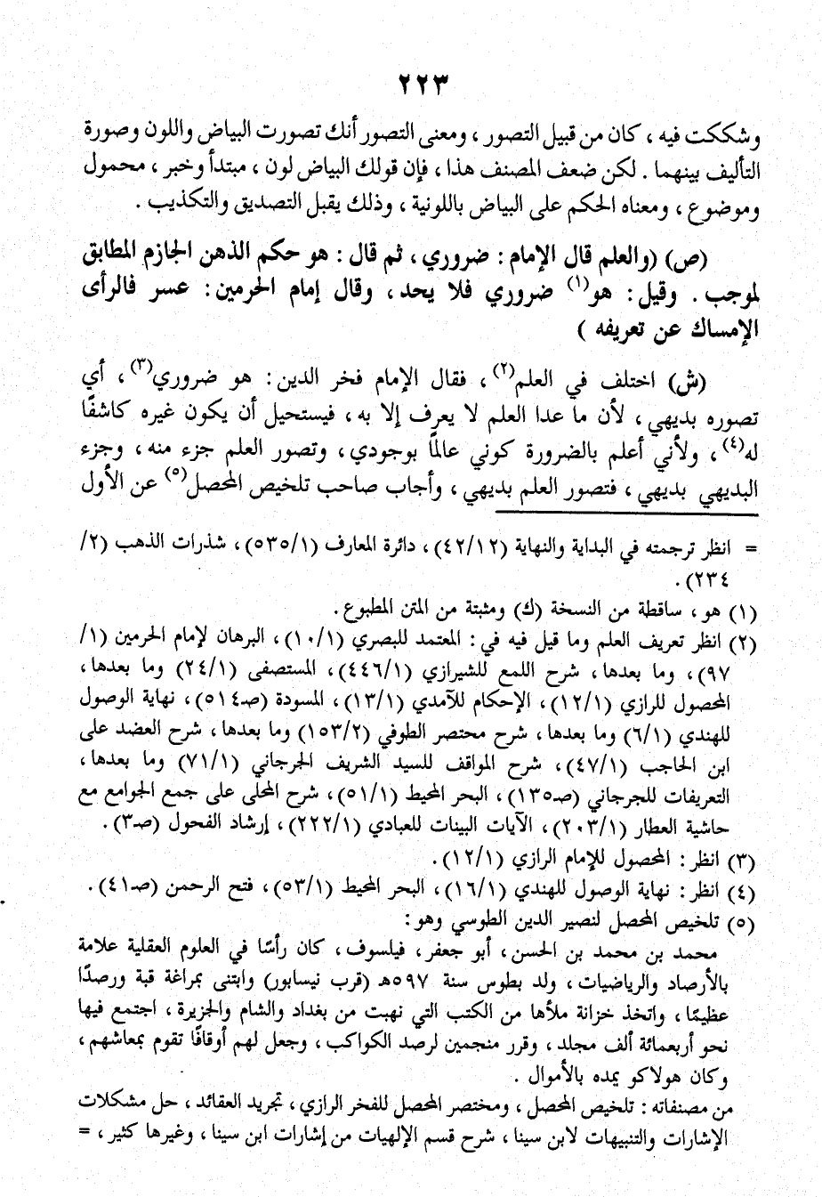 ش: اختلف في العلم فقال الإمام فخر الدين: هو ضروري، أي تصوره بديهي لأنَّ ما عدا العلم لا يعرف إلا به، فيستحيل أن يكون غيره كاشفاً له، ولأني أعلم بالضرورة كوني عالماً بوجودي، وتصور العلم جزء منه، وجزء البديهي بديهي، فتصور العلم بديهي، وأجاب صاحب تلخيص المحصل عن الأول