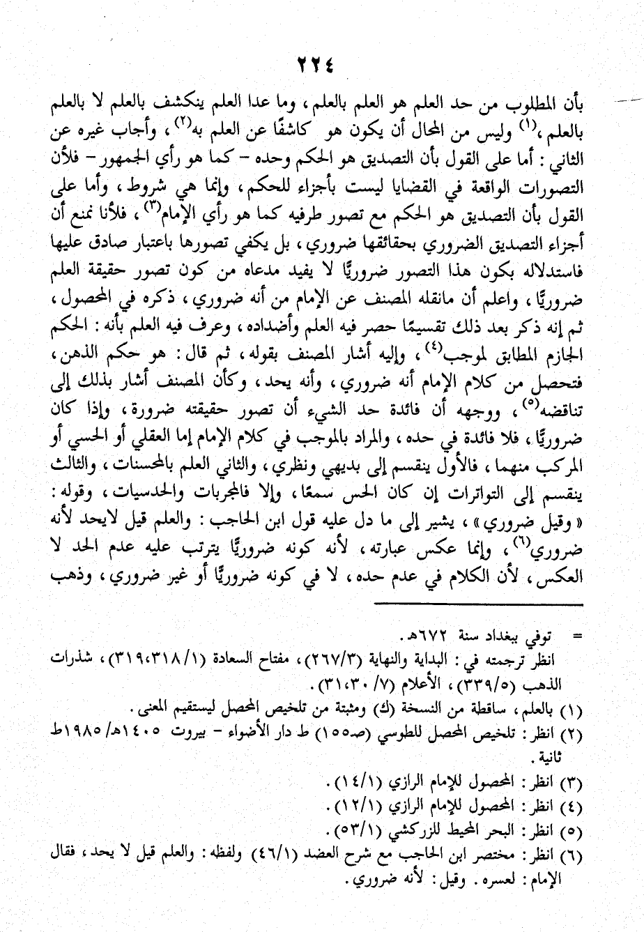 بأن المطلوب من حد العلم هو العلم بالعلم، وما عدا العلم ينكشف بالعلم لا بالعلم بالعلم، وليس من المحال أن يكون هو كاشفاً عن العلم به، وأجاب غيره عن الثانِي: أمَّا على القول بأن التصديق هو الحكم وحده ـ كما هو رأي الجمهور ـ فلأن التصورات الواقعة في القضايا ليست بأجزاء للحكم، وإنما هي شروط، وأما على القول بأن التصديق هو الحكم معَ تصور طرفيه كما هو رأي الإمام، فلأنا نمنع أن أجزاء التصديق الضروري بحقائقها ضروري، بل يكفي تصورها باعتبار صادق عليها فاستدلاله بكون هذا التصور ضرورياً لا يفيد مدعاه من كون تصور حقيقة العلم ضرورياً، واعلم أن ما نقله الْمُصَنِّف عن الإمام من أنه ضروري، ذكره في المحصول، ثمَّ إنه ذكر بعد ذلك تقسيماً حصر فيه العلم وأضداده، وعرف فيه العلم بأنه: الحكم الجازم المطابق لموجب، وإليه أشار الْمُصَنِّف بقوله، ثمَّ قالَ: هو حكم الذهن، فتحصل من كلام الإمام أنه ضروري، وأنه يحد، وكأن الْمُصَنِّف أشار بذلك إلى تناقضه، ووجهه أن فائدة حد الشيء أن تصور حقيقته ضرورة، وإذا كانَ ضرورياً فلا فائدة في حده، والمراد بالموجب في كلام الإمام إما العقلي أو الحسي أو المركب منهما، فالأول ينقسم إلى بديهي ونظري، والثاني العلم بالمحسنات والثالث ينقسم إلى التواترات إن كانَ الحس سمعاً، وإلا فالمجربات والحدسيات، وقوله: (وقيل ضروري) يشير إلى ما دل عليه قول ابْن الْحَاجِبِ: والعلم قيل لا يحد لأنَّه ضروري وإنما عكس عبارته؛ لأنَّه كونه ضرورياً يترتب عليه عدم الحد لا العكس؛ لأنَّ الكلام في عدم حده، لا في كونه ضرورياً أو غير ضروري، وذهب
