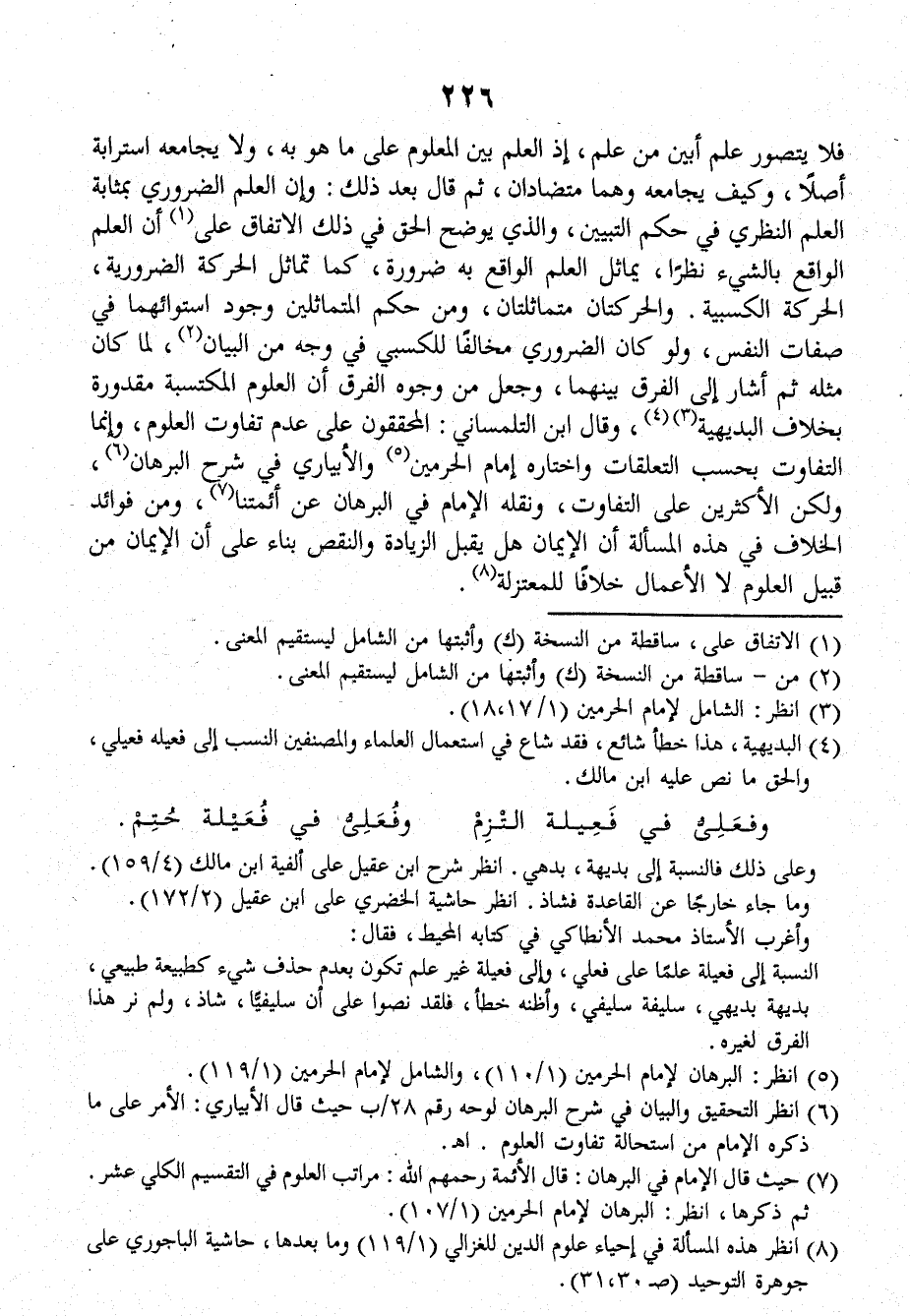 فلا يتصور علم أبين من علم، إذ العلم بينَ المعلوم على ما هو به ولا يجامعه استرابة أصلاً، وكيف يجامعه وهما متضادان، ثمَّ قالَ بعد ذلك، وإن العلم الضروري بمثابة العلم النظري في حكم التبيين، والذي يوضح الحق في ذلك الاتفاق على أن العلم الواقع بالشيء نظراً، يماثل العلم الواقع به ضرورة، كما تماثل الحركة الضرورية، الحركة الكسبية، والحركتان متماثلتان، ومن حكم المتماثلين وجود استوائهما في صفات النفس، ولو كانَ الضروري مخالفاً للكسبي في وجه من البيان، لما كانَ مثله ثمَّ أشار إلى الفرق بينهما، وجعل من وجوه الفرق أن العلوم المكتسبة مقدورة بخلاف البديهية، وقالَ ابن التلمساني: المحققون على عدم تفاوت العلوم، وإنما التفاوت بحسب التعلقات واختاره إمام الحرمين والإبياري في شرح البرهان، ولكن الأكثرين على التفاوت، ونقله الإمام في البرهان عن أئمتنا، ومن فوائد الخلاف في هذه المسألة أن الإيمان هل يقبل الزيادة والنقص بناء على أن الإيمان من قبيل العلوم لا الأعمال خلافاً للمعتزلة.