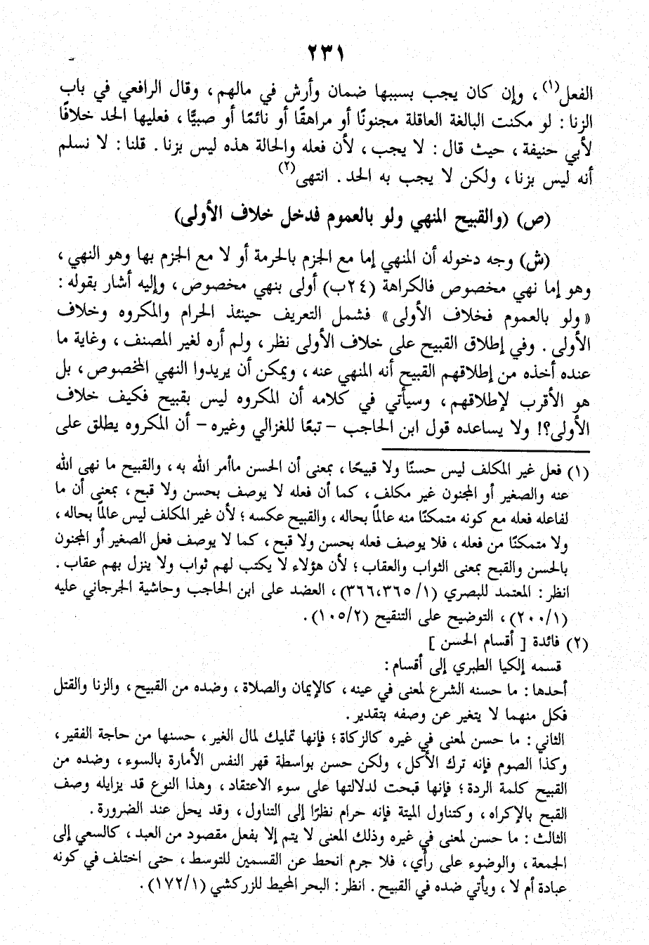 ش: وجه دخوله أن المنهي إما معَ الجزم بالحرمة أو لا معَ الجزم بها وهو النهي، وهو إما نهي مخصوص فالكراهة (٢٤ ب) أولى بنهي مخصوص، وإليه أشار بقوله: (ولو بالعموم فخلاف الأولى) فشمل التعريف حينئذ الحرام والمكروه، وخلاف الأولى، وفي إطلاق القبيح على خلاف الأولى نظر، ولم أره لغير الْمُصَنِّف، وغاية ما عندَه أخذه من إطلاقهم القبيح أنه المنهي عنه، ويمكن أن يريدوا النهي المخصوص، بل هو الأقرب لإطلاقهم وسيأتي في كلامه أن المكروه ليس بقبيح فكيف خلاف الأولى؟ ولا يساعده قول ابْن الْحَاجِبِ ـ تبعاًَ للغزالي وغيره، ـ أن المكروه يطلق على