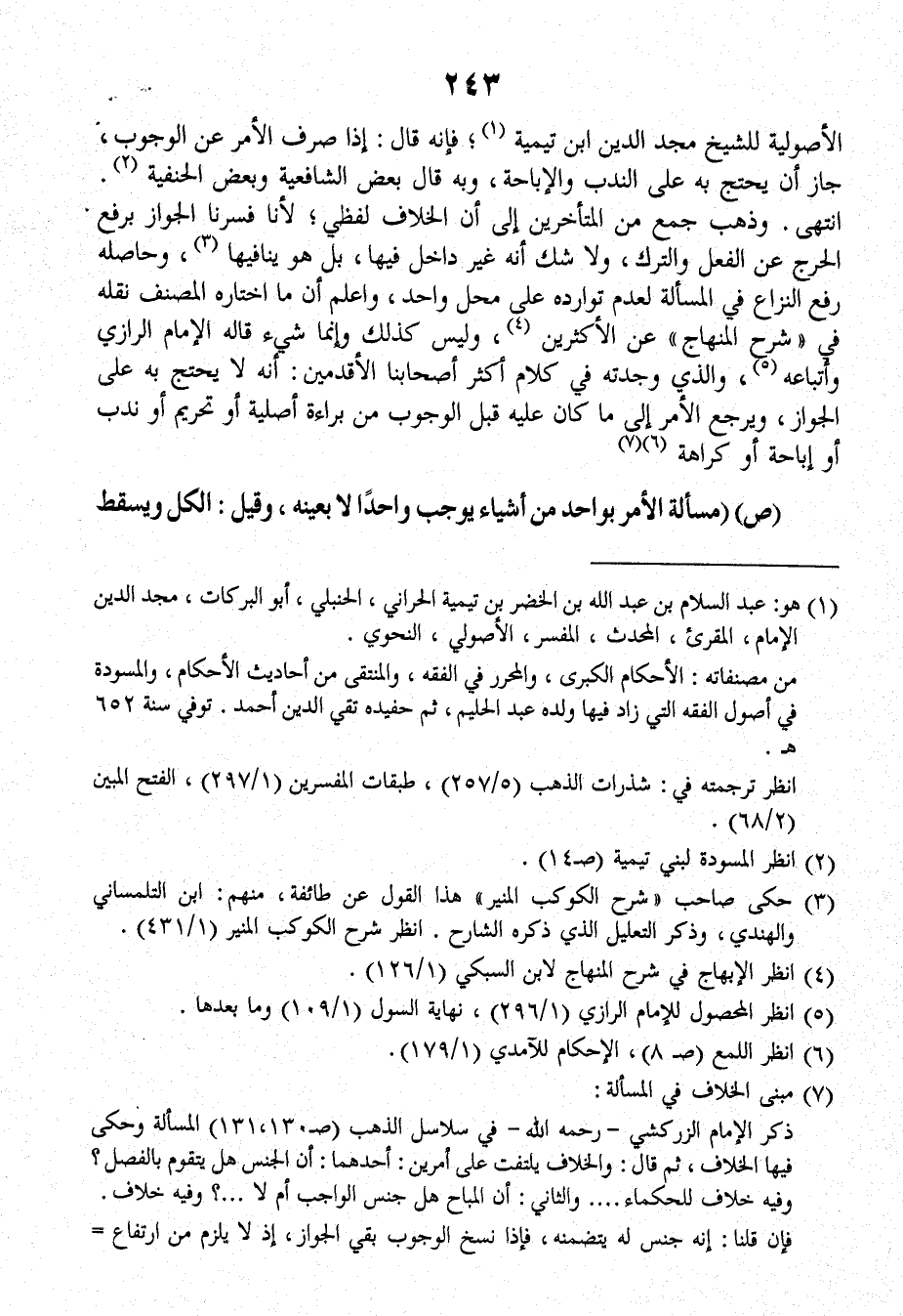 الأصولية للشيخ مجد الدين ابن تَيْمِيَّةَ، فإنَّه قالَ: إذا صرف الأمر عن الوجوب، جاز أن يحتج به على الندب والإباحة، وبه قالَ بعض الشافعية وبعض الحنفية.