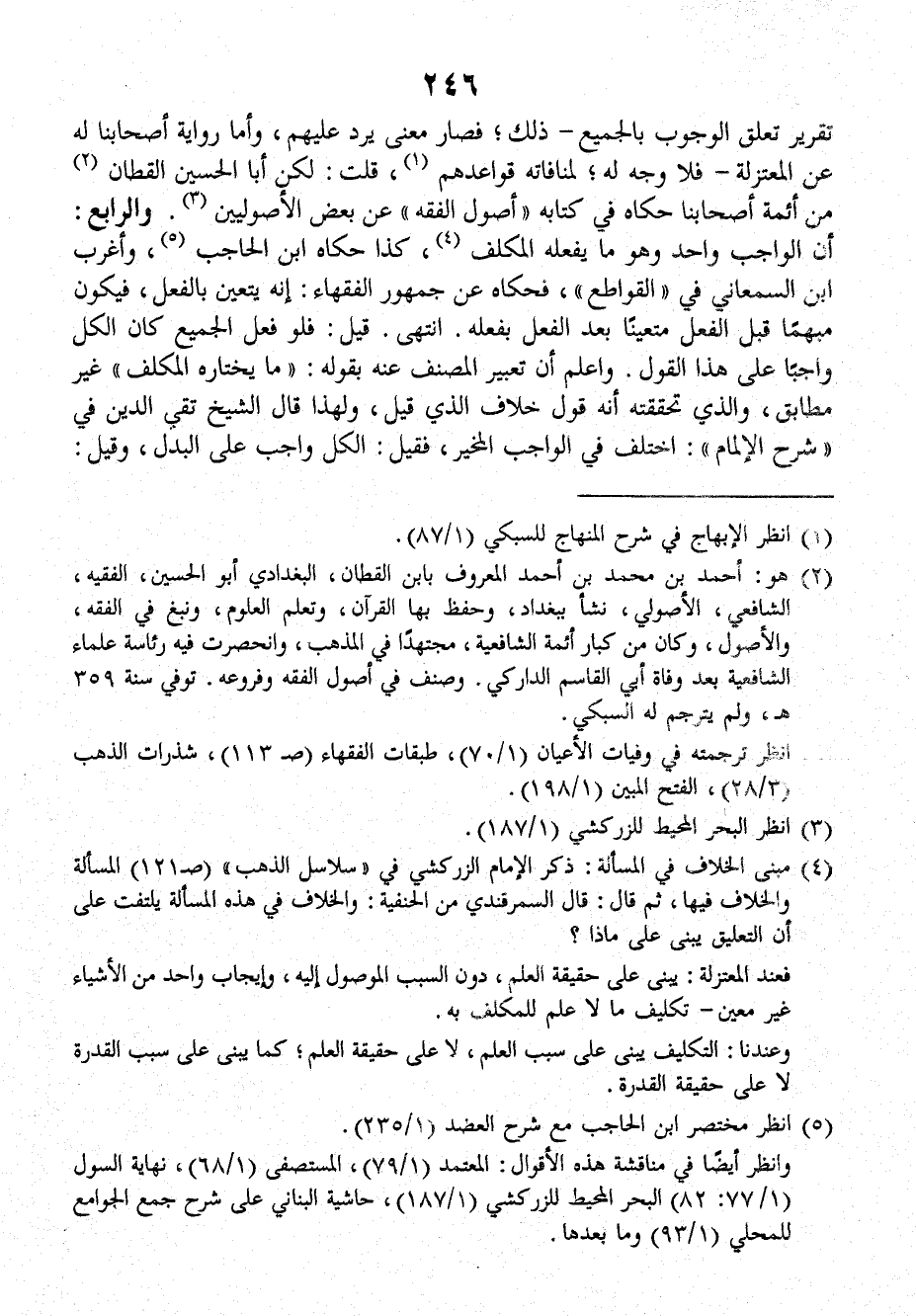 تقرير تعلق الوجوب بالجميع ـ ذلك، فصار معنى يرد عليهم، وأما رواية أصحابنا له عن المعتزلة ـ، فلا وجه له، لمنافاته قواعدهم، قلت: لكن أبا الحسين القطان من أئمة أصحابنا حكاه في كتابه (أصول الفقه) عن بعض الأصوليين. والرابع: أن الواجب واحد وهو ما يفعله المكلف كذا حكاه ابْن الْحَاجِبِ، وأغرب ابن السمعاني في (القواطع) فحكاه عن جمهور الفقهاء: إنه يتعين بالفعل، فيكون مبهما قبل الفعل متعينا بعد الفعل بفعله. انتهى.