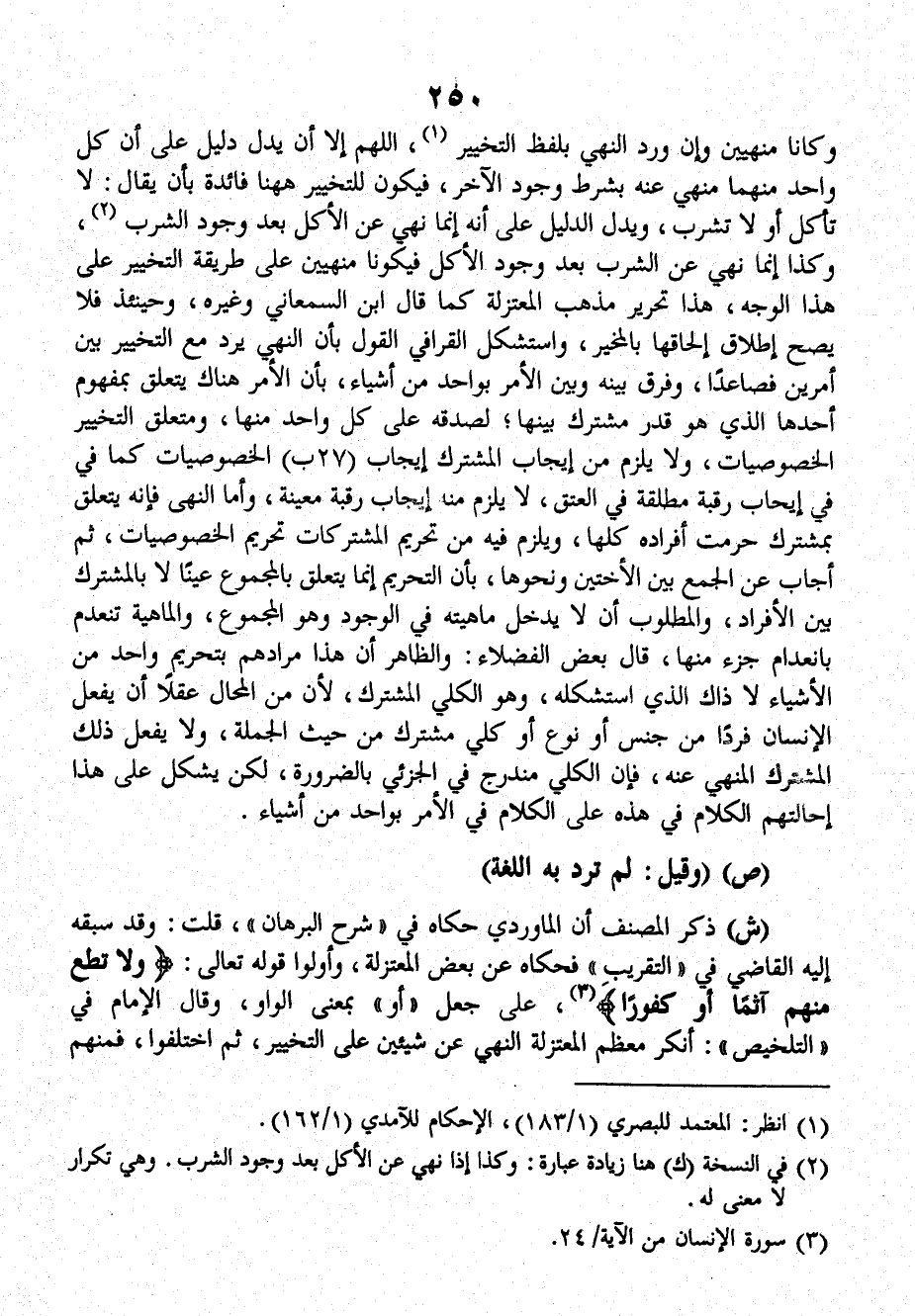 ش: ذكر الْمُصَنِّف أن الماوردي حكاه في (شرح البرهان)، قلت: وقد سبقه إليه القاضي في (التقريب) فحكاه عن بعض المعتزلة، وأولوا قَوْلُه تَعَالَى: {ولا تطع منهم آثماً أو كفوراً} على جعل (أو) بمعنى الواو، وقالَ الإمام في (التلخيص) أنكر معظم المعتزلة النهي عن شيئين على التخيير، ثمَّ اختلفوا، فمنهم