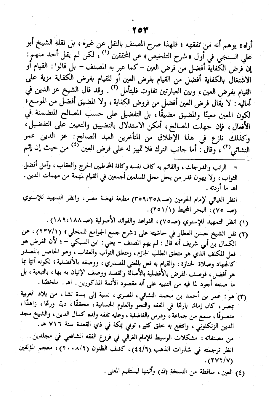 أراه) يوهم أنه من تفقهه، فلهذا صرح الْمُصَنِّف بالنقل عن غيره، بل نقله الشيخ أبو علي السنجي في أول (شرح التلخيص) عن المحققين، لكن لم يقل أحد منهم: إن فرض الكفاية أفضل من فرض العين ـ كما عبر به الْمُصَنِّف ـ بل قالُوا: القيام أو الاشتغال بالكفاية أفضل من القيام بفرض العين أو للقيام بفرض الكفاية مزية على القيام بفرض العين، وبين العبارتين تفاوت فليتأمل، وقد قالَ الشيخ عز الدين في أماليه: لا يقال فرض العين أفضل من فروض الكفاية، ولا المضيق أفضل من الموسع، لكون المعين معيناً والمضيق مضيقاً، بل التفضيل على حسب المصالح المتضمنة في الأفعال، فإنَّ جهلت المصالح، أمكن الاستدلال بالتضييق والتعيين على التفضيل، وكذلك نازع في هذا الإطلاق من المتأخرين العبد الصالح: عز الدين عمر النشائي، وقالَ: أمَّا جانب الترك فلا تمييز له على فرض العين، من حَيْثُ إن أثم