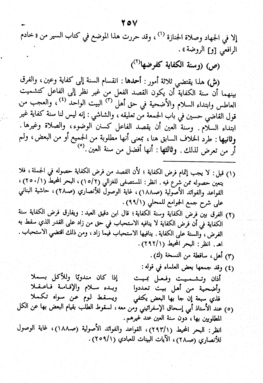 ش: هذا يقتضي ثلاثة أمور: أحدها: انقسام السنة إلى كفاية وعين، والفرق بينَهما أن سنة الكفاية أن يكون القصد الفعل من غير نظر إلى الفاعل كتشميت العاطس وابتداء السلام والأضحية في حق أهل البيت الواحد، والعجب من قول القاضي حسين في باب الجمعة من تعليقه، والشاشي: إنه ليس لنا سنة كفاية غير ابتداء السلام، وسنة العين أن يقصد الفاعل كسنن الوضوء، والصلاة وغيرها.