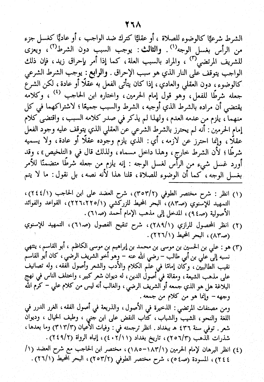 والرابع: يوجب الشرط الشرعي كالوضوء، دون العقلي والعادي، إذا كانَ يتأتى الفعل به عقلاً أو عادة، لكن الشرع جعله شرطاً للفعل، وهو قول إمام الحرمين، واختاره ابْن الْحَاجِبِ، وكلامه يقتضي أن مراده بالشرط الذي أوجبه، الشرط والسبب جميعاً، لاشتراكهما في كل منهما، يلزم من عدمه العدم، ولهذا لم يذكر في صدر كلامه السبب، واقتضى كلام إمام الحرمين: أنه لم يحترز بالشرط الشرعي عن العقلي الذي يتوقف عليه وجود الفعل عقلاً، وإنما احترز عن لازمه أي: الذي يلزم وجوده عقلاً أو عادة، ولا يسميه شرطاً؛ لأنَّ الشرط خارج، وهذا داخل مسماه، ولذلك قالَ في (التلخيص) وقد أورد غسل شيء من الرأس لغسل الوجه: إنه يلزم من جعله شرطاً متضمناً للأمر بغسل الوجه، كما أن الوضوء للصلاة، قلنا هذا لأنَّه نصه، بل نقول: ما لا يتم