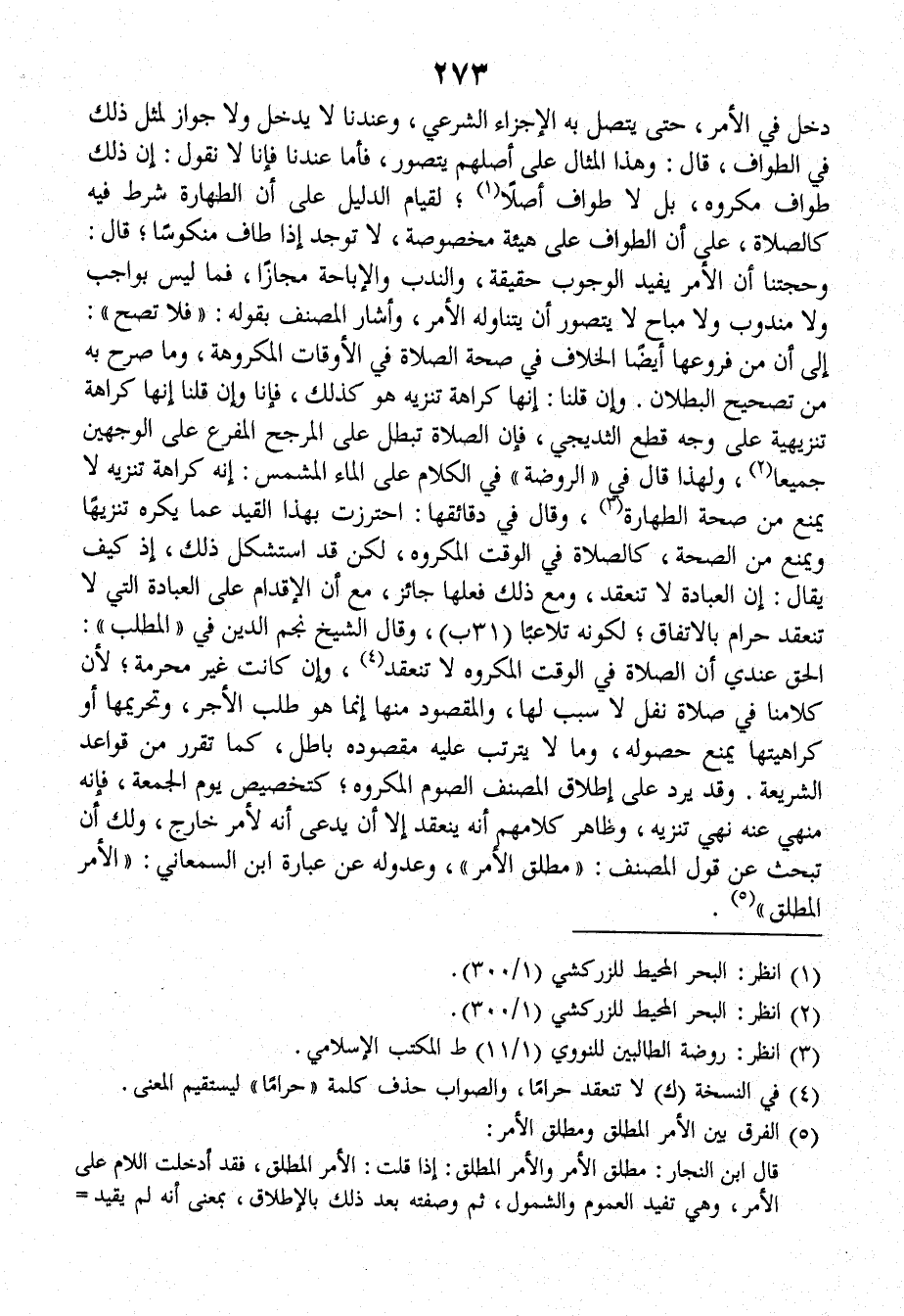 ذلك، إذ كيف يقال: إن العبادة لا تنعقد، ومع ذلك فعلها جائز، معَ أن الإقدام على العبادة التي لا تنعقد حرام بالاتفاق، لكونه تلاعباً (٣١ ب) وقالَ الشيخ نجم الدين في (المطلب): الحق عندَي أن الصلاة في الوقت المكروه لا تنعقد، وإن كانت غير محرمة؛ لأنَّ كلامنا في صلاة نفل لا سبب لها، والمقصود منها إنما هو طلب الأجر، وتحريمها أو كراهيتها يمنع حصوله، وما لا يترتب عليه مقصوده باطل، كما تقرر من قواعد الشريعة، وقد يرد على إطلاق الْمُصَنِّف الصوم المكروه، كتخصيص يوم الجمعة، فإنَّه منهي عنه نهي تنزيه، وظاهر كلامهم أنه ينعقد إلا أن يدعى أنه لأمر خارج، ولك أن تبحث عن قول الْمُصَنِّف: (مطلق الأمر) وعدوله عن عبارة ابن السمعاني: (الأمر المطلق).
