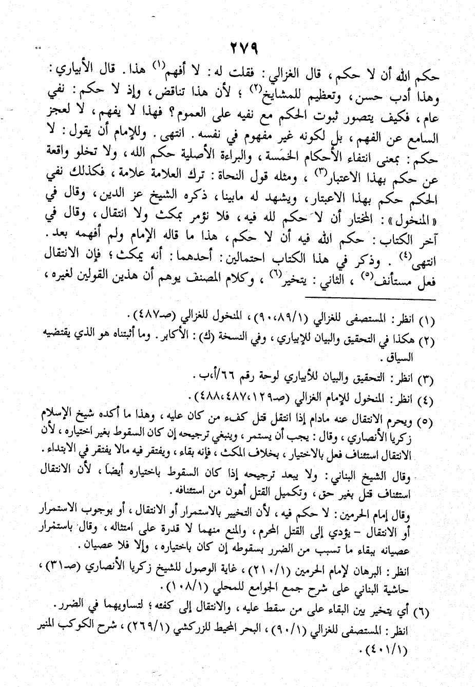 حكم الله أن لا حكم، قالَ الغزالي: فقلت له: لا أفهم هذا، قالَ الأبياري: وهذا أدب حسن، وتعظيم للمشايخ؛ لأنَّ هذا تناقض، وإذ لا حكم: نفي عام، فكيف يتصور ثبوت الحكم معَ نفيه على العموم؟ فهذا لا يفهم، لا لعجز السامع عن الفهم، بل لكونه غير مفهوم في نفسه، انتهى، وللإمام أن يقول: لا حكم: بمعنى انتفاء الأحكام الخمسة، والبراءة الأصلية حكم الله، ولا تخلو واقعة عن حكم بهذا الاعتبار، ومثله قول النحاة: ترك العلامة علامة، فكذلك نفي الحكم حكم بهذا الاعتبار، ويشهد له ما بينا، ذكره الشيخ عز الدين، وقالَ في (المنخول) المختار أن لا حكم لله فيه، فلا نؤمر بمكث ولا انتقال، وقالَ في آخر الكتاب: حكم الله فيه أن لا حكم، هذا ما قاله الإمام ولم أفهمه بعد، انتهى.