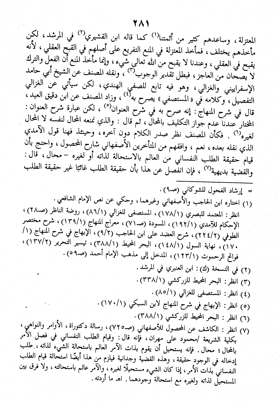 المعتزلة، وساعدهم كثير من أئمتنا، كما قاله ابن القشيري في المرشد، لكن مأخذهم يختلف، فمأخذ المعتزلة في المنع التفريع على أصلهم في القبح العقلي؛ لأنَّه يقبح في العقلي، وعندنا لا يقبح من اللهِ تعالى شيء، وإنما مأخذ المنع أن الفعل والترك لا يصحان من العاجز فبطل تقدير الوجوب، ونقله المصنف عن الشيخ أبي حامد الإسفراييني والغزالي، وهو فيه تابع للصفي الهندي، لكن سيأتي عن الغزالي التفصيل، وكلامه في (المستصفى) يصرح به، وزاد المصنف عن ابن دَقِيقِ العِيدِ، قالَ في شرح المنهاج: إنه صرح به في شرح العنوان، لكن عبارة شرح العنوان: المختار عندَنا عدم جواز التكليف بالمحال، ثمَّ قالَ: والذي نمنعه المحال لنفسه لا المحال لغيره، فكأن المصنف نظر صدر الكلام دون آخره، وحينئذ فهنا قول الآمدي الذي نقله بعده، نعم، وافقهم من المتأخرين الأصفهاني شارح المحصول، واحتج بأن قيام حقيقة الطلب النفساني من العالم بالاستحالة لذاته أو لغيره ـ محال، قالَ: والقضية بديهية، فإنَّ انفصل عن هذا بأن حقيقة الطلب غائباً غير حقيقة الطلب