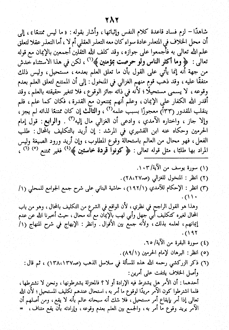 شاهداً ـ لزم فساد قاعدة كلام النفس وإثباتها، وأشار بقوله: (ما ليس ممتنعاً) إلى أن محل الخلاف في المتعذر عادة سواء كانَ معه التعذر العقلي أم لا، أمَّا التعذر عقلاً لتعلق علم الله تعالى به فأجمعوا على جوازه، وقد كلف الله الثقلين أجمعين بالإيمان معَ قوله تعالى: {وما أكثر الناس ولو حرصت بمؤمنين} لكن في هذا الاستثناء خدش من جهة أنه إنما يأتي على القول بأن ما تعلق العلم بعدمه، مستحيل، وليس ذلك متفقاً عليه، وقد ذهب قوم منهم الغزالي في المنخول: إلى أن الممتنع لتعلق العلم بعدم وقوعه، لا يسمى مستحيلاً؛ لأنَّه في ذاته جائز الوقوع، فلا تتغير حقيقته بالعلم، وقد أقدر الله الكفار على الإيمان، وعلم أنهم يمتنعون معَ القدرة، فكان كما علم، فلم ينقلب المقدور (٣٣ أ) معجوزاً