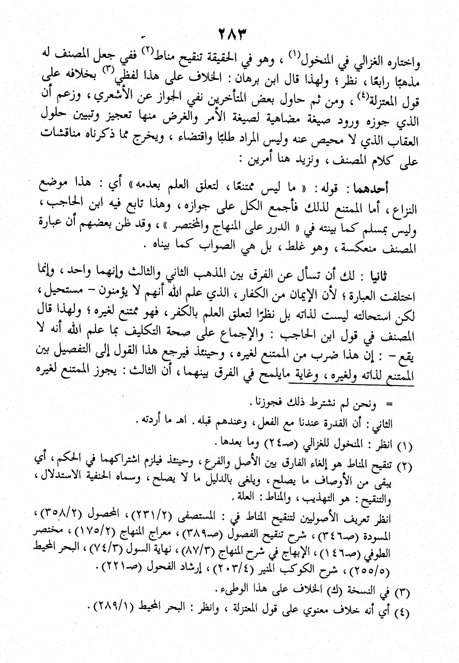 ثانيا: لك أن تسأل عن الفرق بينَ المذهب الثاني والثالث وإنهما واحد، وإنما اختلفت العبارة؛ لأنَّ الإيمان من الكفار، الذي علم الله أنهم لا يؤمنون ـ مستحيل، لكن استحالته ليست لذاته بل نظراً لتعلق العلم بالكفر، فهو ممتنع لغيره، ولهذا قالَ المصنف في قول ابن الحاجب: والإجماع على صحة التكليف بما علم الله أنه لا يقع ـ: (إن هذا ضرب من الممتنع لغيره، وحينئذ فيرجع هذا القول إلى التفصيل بينَ الممتنع لذاته ولغيره، وغاية ما يلمح في الفرق بينهما، أن الثالث: يَجُوز الممتنع لغيره