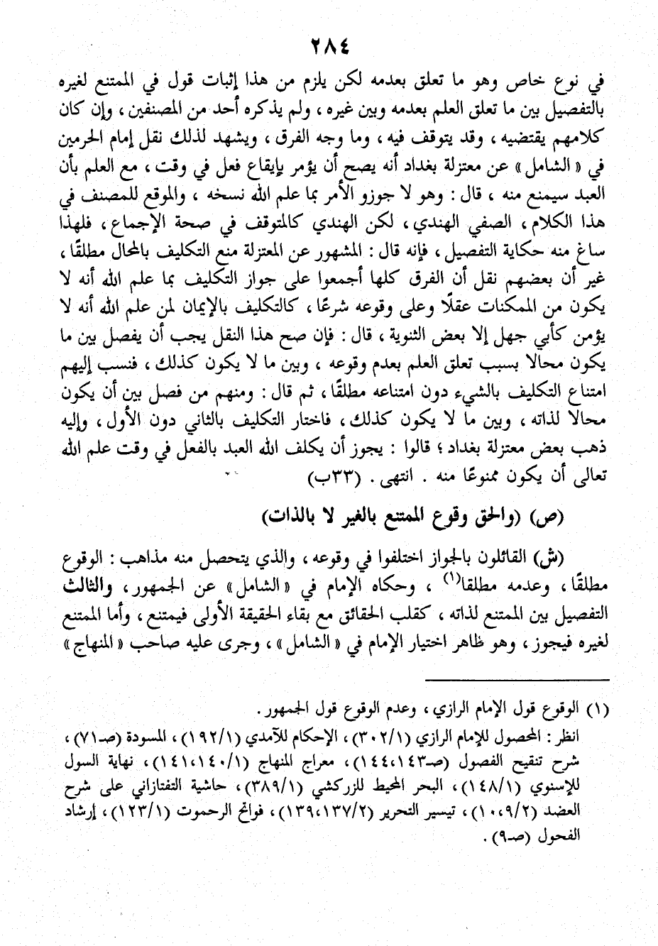 في نوع خاص وهو ما تعلق بعدمه لكن يلزم من هذا إثبات قول في الممتنع لغيره بالتفصيل بينَ ما تعلق العلم بعدمه وبين غيره، ولم يذكره أحد من المصنفين، وإن كانَ كلامهم يقتضيه، وقد يتوقف فيه، وما وجه الفرق، ويشهد لذلك نقل إمام الحرمين في (الشامل) عن معتزلة بغداد أنه يصح أن يؤمر بإيقاع فعل في وقت، معَ العلم بأن العبد سيمنع منه، قالَ: وهو لا جوزو الأمر بما علم الله نسخه، والموقع للمصنف في هذا الكلام، الصفي الهندي، لكن الهندي كالمتوقف في صحة الإجماع، فلهذا ساغ منه حكاية التفصيل فإنَّه قالَ: المشهور عن المعتزلة منع التكليف بالمحال مطلقاً، غير أن بعضهم نقل أن الفرق كلها أجمعوا على جواز التكليف بما علم الله أنه لا يكون من الممكنات عقلاً وعلى وقوعه شرعاً، كالتكليف بالإيمان لمن علم الله أنه لا يؤمن كأبي جهل إلا بعض الثنوية، قالَ: فإنَّ صح هذا النقل يجب أن يفصل بينَ ما يكون محالاً بسبب تعلق العلم بعدم وقوعه، وبين ما لا يكون كذلك، فنسب إليهم امتناع التكليف بالشيء دون امتناعه مطلقاً، ثمَّ قالَ: ومنهم من فصل بينَ أن يكون محالاً لذاته، وبين ما لا يكون كذلك فاختار التكليف بالثاني دون الأول، وإليه ذهب بعض معتزلة بغداد، قالُوا: يَجُوز أن يكلف الله العبد بالفعل في وقت علم الله تعالى أن يكون ممنوعاً منه. انتهى (٣٣ ب).