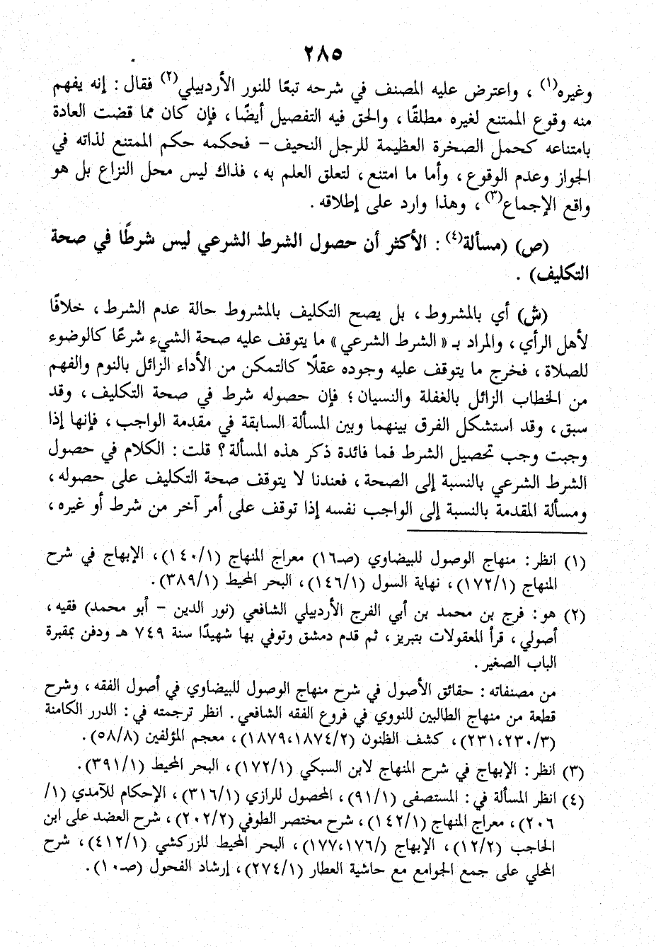 ش: أي بالمشروط، بل يصح التكليف بالمشروط حالة عدم الشرط، خلافاً لأهل الرأي والمراد بـ (الشرط الشرعي) ما يتوقف عليه صحة الشيء شرعاً كالوضوء للصلاة فخرج ما يتوقف عليه وجوده عقلاً كالتمكن من الأداء الزائل بالنوم والفهم من الخطاب الزائل بالغفلة والنسيان فإنَّ حصوله شرط في صحة التكليف، وقد سبق، وقد استشكل الفرق بينَهما وبين المسألة السابقة في مقدمة الواجب، فإنَّها إذا وجبت وجب تحصيل الشرط فما فائدة ذكر هذه المسألة؟ قلت: الكلام في حصول الشرط الشرعي بالنسبة إلى الصحة، فعندنا لا يتوقف صحة التكليف على حصوله، ومسألة المقدمة بالنسبة إلى الواجب نفسه إذا توقف على أمر آخر من شرط أو غيره،