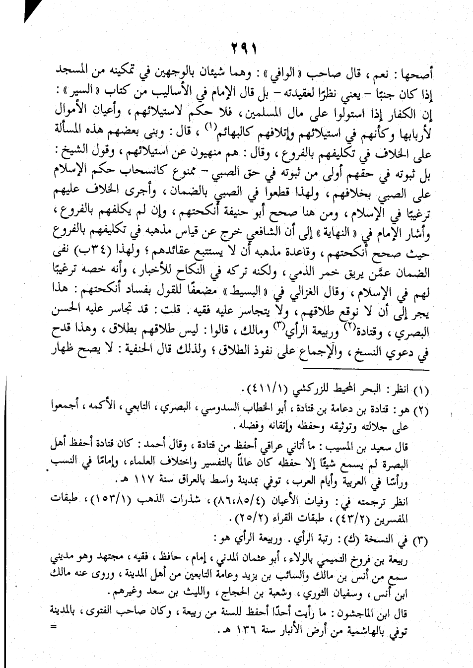 أصحها: نعم، قالَ صاحب (الوافي) وهما شيئان بالوجهين في تمكينه من المسجد إذا كانَ جنباً ـ يعني نظراً لعقيدته ـ بل قالَ الإمام في الأساليب من كتاب (السير): إن الكفار إذا استولوا على مال المسلمين، فلا حكم لاستيلائهم، وأعيان الأموال لأربابها وكأنهم في استيلائهم وإتلافهم كالبهائم، قالَ: وبنى بعضهم هذه المسألة على الخلاف في تكليفهم بالفروع، وقالَ: هم منهيون عن استيلائهم، وقول الشيخ: بل ثبوته في حقهم أولى من ثبوته في حق الصبي ـ ممنوع كانسحاب حكم الإسلام على الصبي بخلافهم، ولهذا قطعوا في الصبي بالضمان، وأجرى الخلاف عليهم ترغيباً في الإسلام، ومن هنا صحح أبو حنيفة أنكحتهم، وإن لم يكلفهم بالفروع، وأشار الإمام في (النهاية) إلى أن الشافعي خرج عن قياس مذهبه في تكليفهم بالفروع حيث صحح أنكحتهم، وقاعدة مذهبه أن لا يستتبع عقائدهم، ولهذا (٣٤ ب) نفى الضمان عمن يريق خمر الذمي، ولكنه تركه في النكاح للأخبار، وأنه خصه ترغيباً لهم في الإسلام، وقالَ الغزالي في (البسيط) مضعفاً للقول بفساد أنكحتهم: هذا يجر إلى أن لا نوقع طلاقهم، ولا يتجاسر عليه فقيه. قلت: قد تجاسر عليه الحسن البصري وقتادة وربيعة الرأي ومالك، قالُوا: ليس طلاقهم بطلاق، وهذا قدح في دعوى النسخ، والإجماع على نفوذ الطلاق، ولذلك قالَ الحنفية: لا يصح ظهار