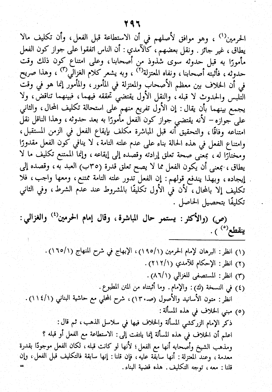 الحرمين، وهو موافق لأصلهم في أن الاستطاعة قبل الفعل، وأن تكليف مالا يطاق، غير جائز، ونقل بعضهم، كالآمدي: أن الناس اتفقوا على جواز كون الفعل مأموراً به قبل حدوثه سوى شذوذ من أصحابنا، وعلى امتناع كون ذلك وقت حدوثه، فأثبته أصحابنا، ونفاه المعتزلة، وبه يشعر كلام الغزالي، وهذا صريح في أن الخلاف بينَ معظم الأصحاب والمعتزلة في المأمور، والمأمور إنما هو في وقت التلبس والحدوث لا قبله، والنقل الأول يقتضي تحققه فيهما، فبينهما تناقض، ولا يجمع بينَهما بأن يقال: إن الأول تفريع منهم على استحالة تكليف المحال، والثاني على جوازه ـ لأنَّه يقتضي جواز كون الفعل مأموراً به بعد حدوثه، وهذا الناقل نقل امتناعه وفاقاً، والتحقيق أنه قبل المباشرة مكلف بإيقاع الفعل في الزمن المستقبل، وامتناع الفعل في هذه الحالة بناء على عدم علته التامة، لا ينافي كون الفعل مقدوراً ومختاراً له، بمعنى صحة تعلق إرادته وقصده إلى إيقاعه، وإنما الممتنع تكليف ما لا يطاق، بمعنى أن يكون الفعل مما لا يصح تعلق قدرة (٣٥ ب) العبد به، وقصده إلى إيجاده، وبهذا يندفع قولهم: إن الفعل تدور علته التامة ممتنع، ومعها واجب، فلا