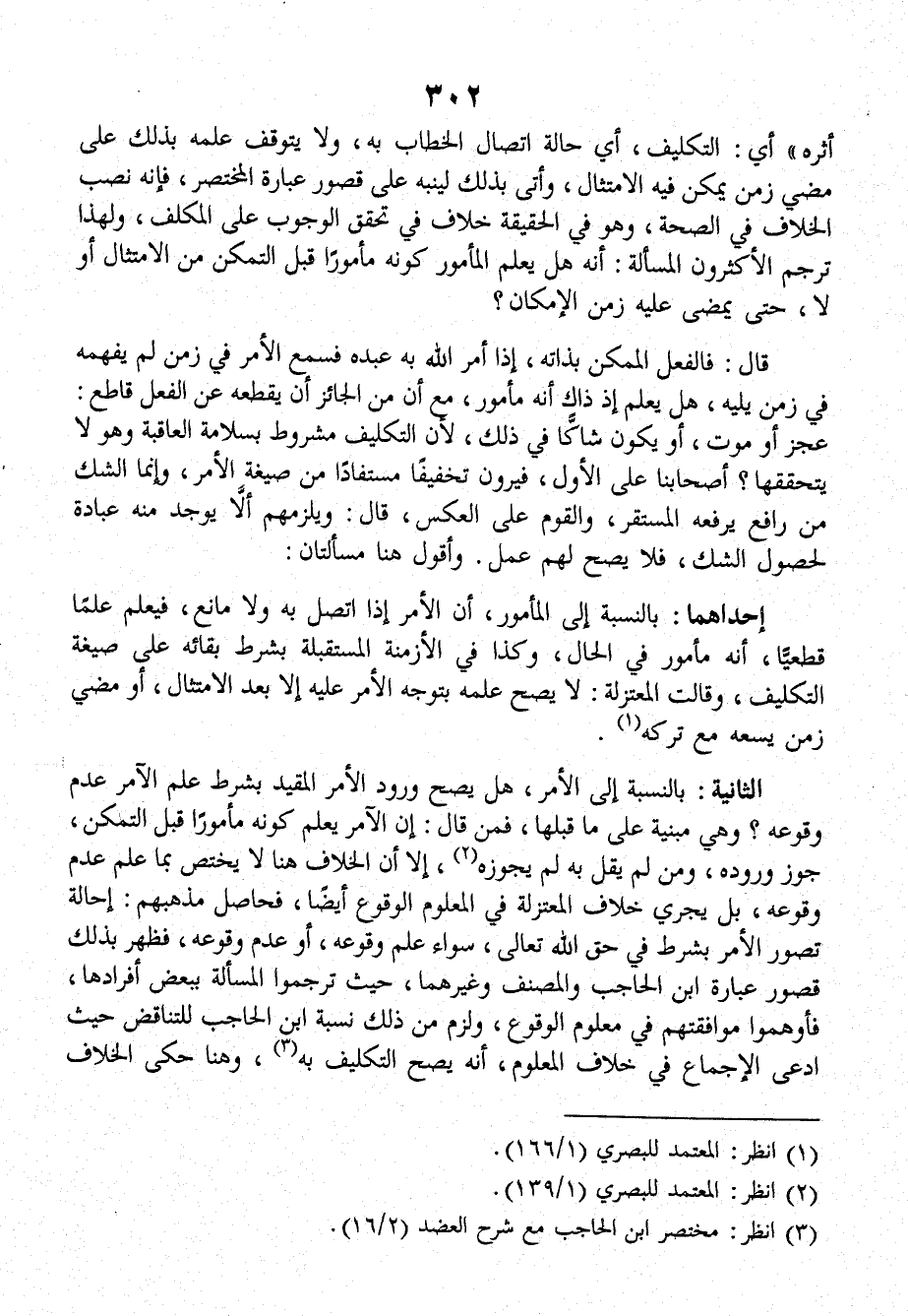 الثانية: بالنسبة إلى الأمر، هل يصح ورود الأمر المقيد بشرط علم الآمر عدم وقوعه؟ وهي مبنية على ما قبلها، فمن قالَ: إن الآمر يعلم كونه مأموراً قبل التمكن، جوز وروده، ومن لم يقل به لم يَجُوزه إلا أن الخلاف هنا لا يختص بما علم عدم وقوعه، بل يجري خلاف المعتزلة في المعلوم الوقوع أيضاًً، فحاصل مذهبهم: إحالة تصور الأمر بشرط في حق الله تعالى، سواء علم وقوعه، أو عدم وقوعه، فظهر بذلك قصور عبارة ابن الحاجب والمصنف وغيرهما، حيث ترجموا المسألة ببعض أفرادها، فأوهموا موافقتهم في معلوم الوقوع، ولزم من ذلك نسبة ابن الحاجب للتناقض حيث ادعى الإجماع في خلاف المعلوم، أنه يصح التكليف به، وهنا حكى الخلاف