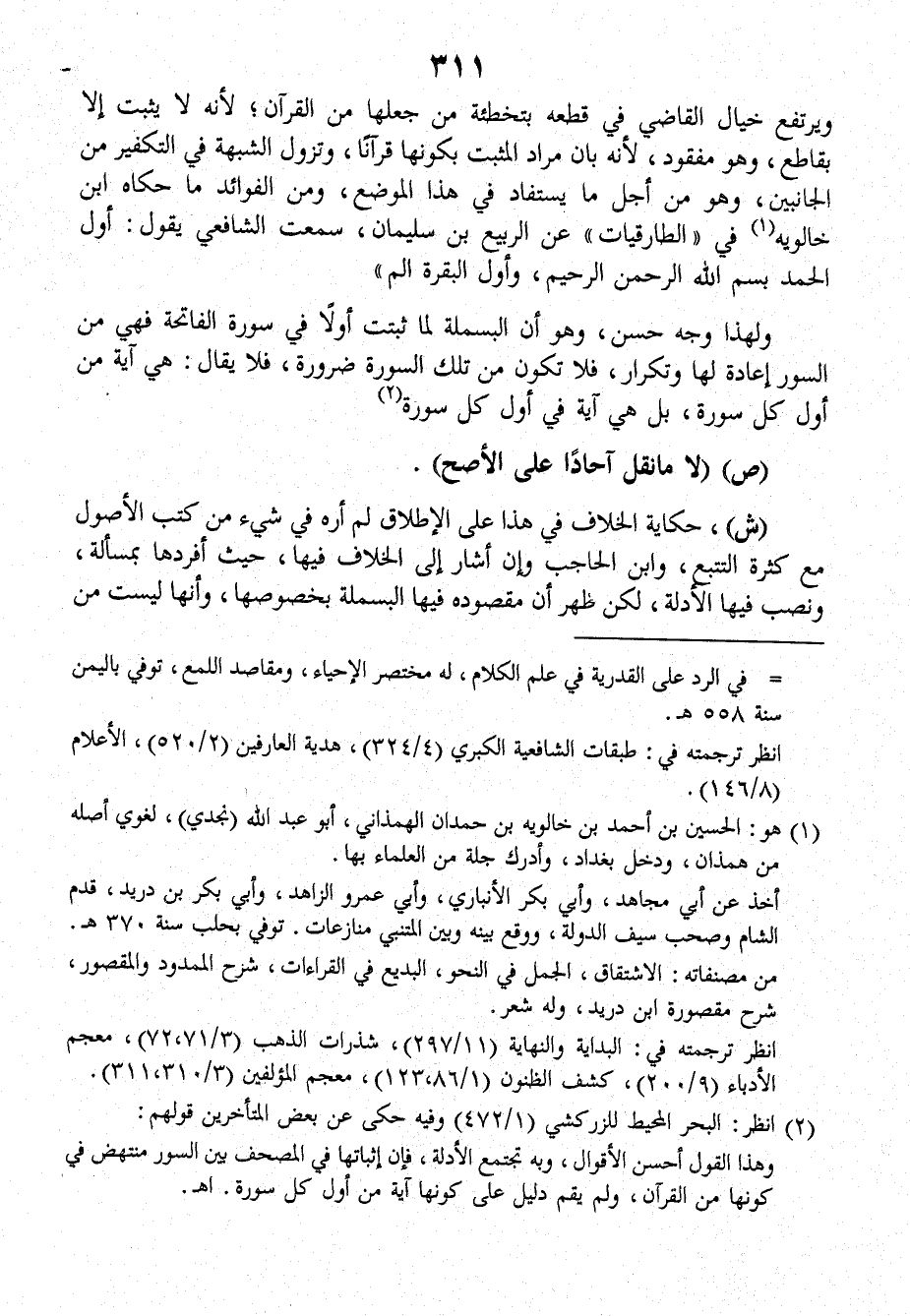 ويرتفع خيال القاضي في قطعه بتخطئة من جعلها من القرآن؛ لأنَّه لا يثبت إلا بقاطع، وهو مفقود لأنَّه بان مراد المثبت بكونها قرآناً، وتزول الشبهة في التكفير من الجانبين، وهو من أجل ما يستفاد في هذا الموضع، ومن الفوائد ما حكاه ابن خالويه في (الطارقيات) عن الرَّبِيع بن سليمان، سمعت الشافعي يقول: أول الحمد بِسْمِ اللهِ الرَّحْمَنِ الرَّحِيمِ وأول البقرة الم).