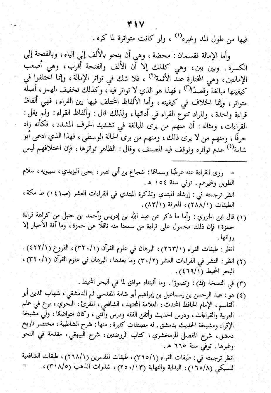 وأما الإمالة فقسمان: محضة، وهي أن ينحو بالألف إلى الياء، وبالفتحة إلى الكسرة، وبين بين، وهي كذلك إلا أن الألف والفتحة أقرب، وهي أصعب الإمالتين، وهي المختارة عندَ الأَئِمَّة، فلا شك في تواتر الإمالة، وإنما اختلفوا في كيفيتها مبالغة وقصداً، فهذا هو الذي لا تواتر فيه، وكذلك تخفيف الهمز، أصله متواتر، وإنما الخلاف في كيفيته، وأما الألفاظ المختلف فيها بينَ القراء، فهي ألفاظ قراءة واحدة، والمراد تنوع القراء في أدائها، ولذلك، قالَ: وألفاظ القراء: ولم يقل: القراءات، ومثاله: أن منهم من يرى المبالغة في تشديد الحرف المشدد، فكأنه زاد حرفاً، ومنهم من لا يرى ذلك، ومنهم من يرى الحالة الوسطى فهذا الذي ادعى أبو شامة عدم تواتره وتوقف فيه المصنف، وقالَ: الظاهر تواترها، فإنَّ اختلافهم ليس