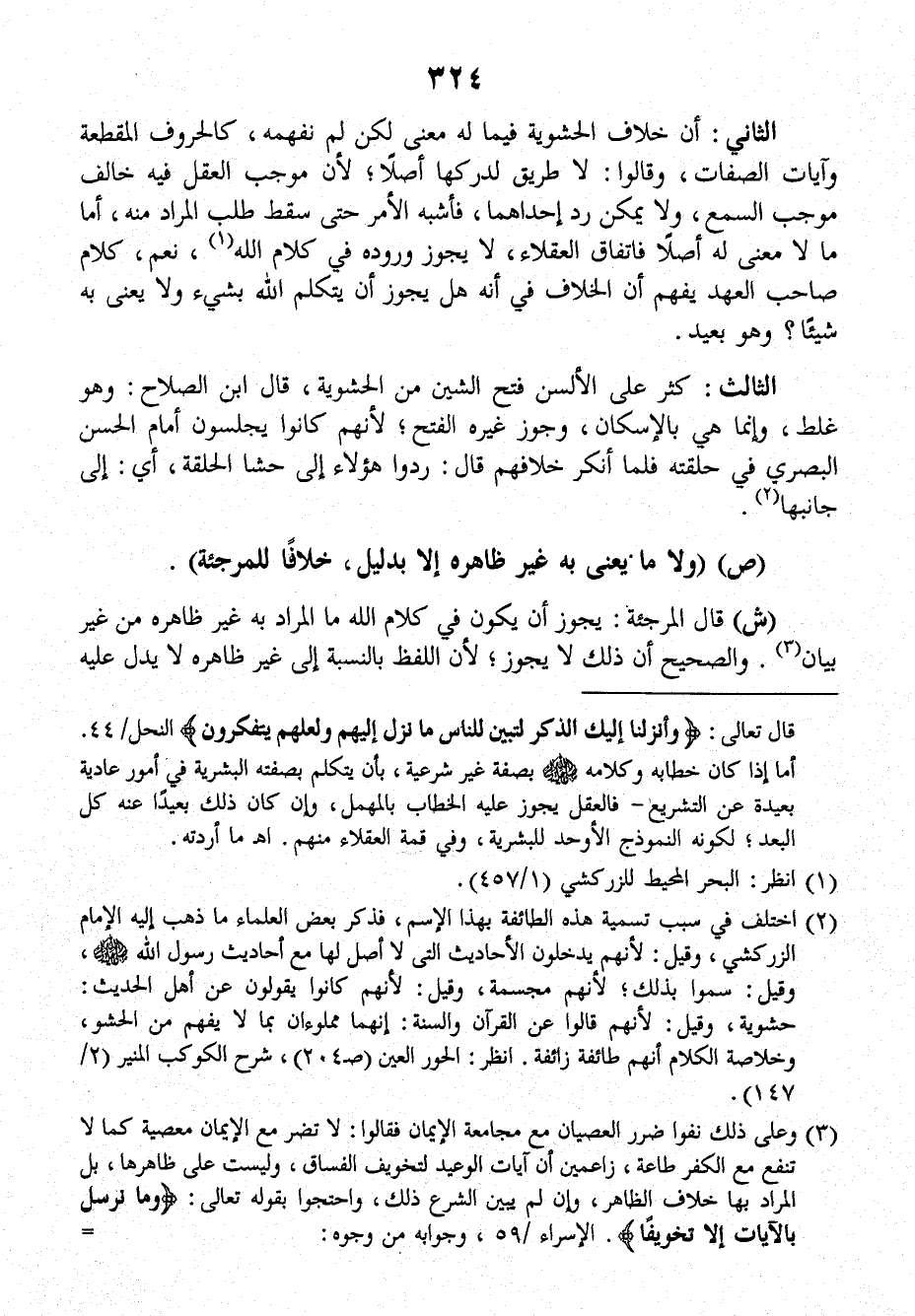 الثاني: أن خلاف الحشوية فيما له معنى لكن لم نفهمه، كالحروف المقطعة وآيات الصفات، وقالوا: لا طريق لدركها أصلاً؛ لأنَّ موجب العقل فيه خالف موجب السمع، ولا يمكن رد إحداهما فأشبه الأمر حتى سقط طلب المراد منه، أمَّا ما لا معنى له أصلاً فاتفاق العقلاء، لا يَجُوز وروده في كلام الله نعم، كلام صاحب العهد يفهم أن الخلاف في أنه هل يَجُوز أن يتكلم الله بشيءٍ ولا يعني به شيئاً؟ وهو بعيد.