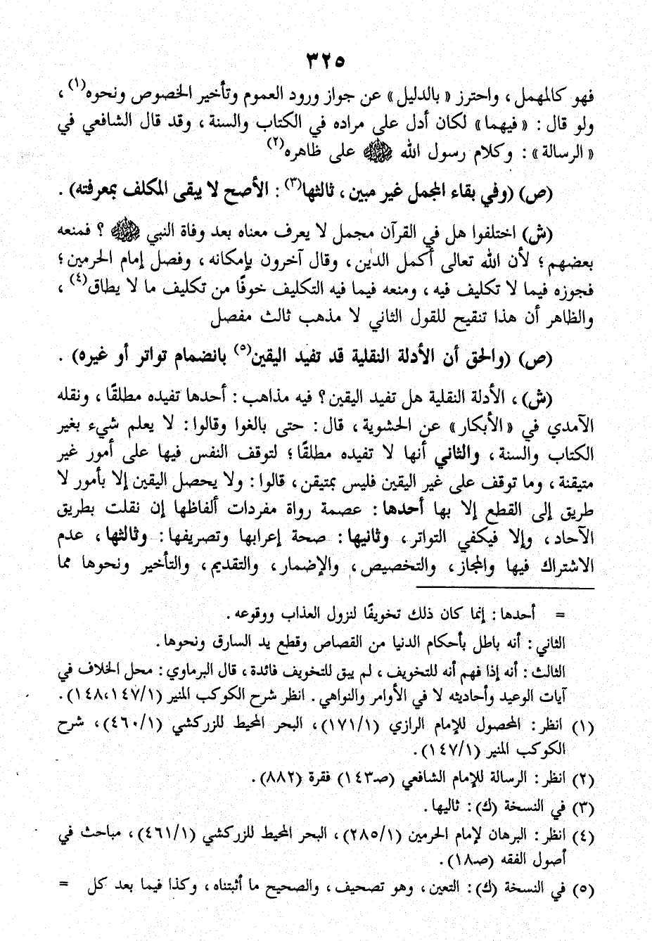 ش: الأدلة النقلية هل تفيد اليقين؟ فيه مذاهب، أحدها تفيده مطلقاً ونقله الآمدي في (الأبكار) عن الحشوية قالَ: حتى بالغوا وقالوا: لا يعلم شيء بغير الكتاب والسنة، والثاني أنها لا تفيده مطلقاً، لتوقف النفس فيها على أمور غير متيقنة، وما توقف على غير اليقين فليس بمتيقن، قالُوا: ولا يحصل اليقين إلا بأمور لا طريق إلى القطع إلا بها أحدها: عصمة رواة مفردات ألفاظها إن نقلت بطريق الآحاد، وإلا فيكفي التواتر، وثانيها: صحة إعرابها وتصريفها: وثالثها: عدم الاشتراك فيها والمجاز، والتخصيص، والإضمار، والتقديم، والتأخير ونحوها مما