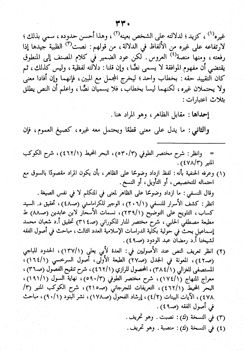 ش: ينقسم المنطوق إلى: نص، وظاهر، فالنص، ما أفاد معنى لا يحتمل غيره، كزيد، لدلالته على الشخص بعينه، وهذا أحسن حدوده، سمي بذلك، لارتفاعه على غيره من الألفاظ في الدلالة، من قولهم: نصت الظبية جيدها إذا رفعته، ومنها منصة العروس، لكن عود الضمير في كلام المصنف إلى المنطوق يقتضي أن مفهوم الموافقة لا يسمى نصاً، وإن قلنا: دلالته لفظية، وليس كذلك، ثمَّ كانَ التقييد حقه: بخطاب واحد، ليخرج المجمل معَ المبين، فإنَّهما وإن أفادا معنى ولا يحتملان غيره لكنهما ليسا بخطاب، فلا يسميان نصاً، واعلم أن النص يطلق بثلاث اعتبارات.
