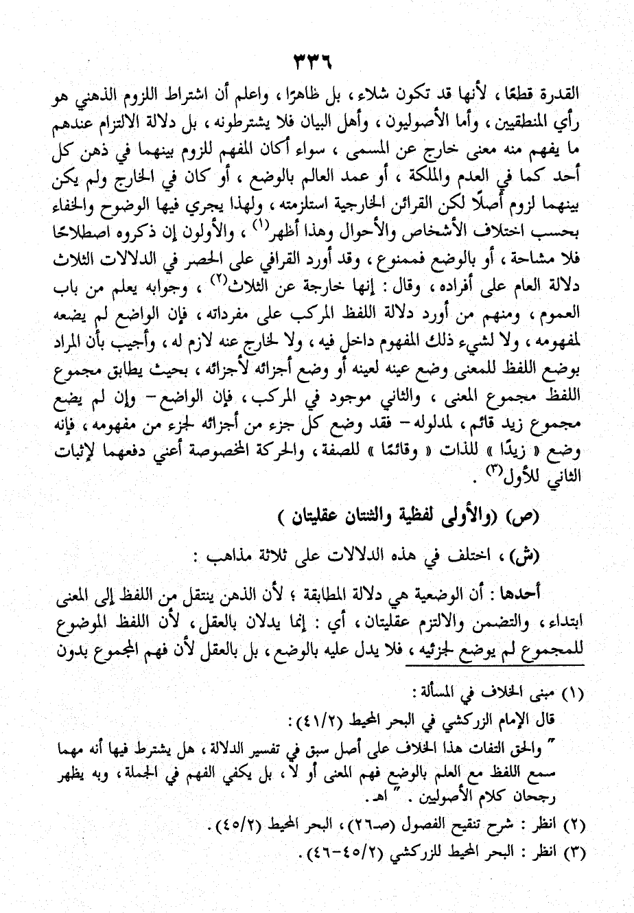 القدرة قطعاً؛ لأنَّها قد تكون شلاء، بل ظاهراً، واعلم أن اشتراط اللزوم الذهني هو رأي المنطقيين، وأما الأصوليون، وأهل البيان فلا يشترطونه، بل دلالة الالتزام عندَهم ما يفهم منه معنى خارج عن المسمى، سواء أكان المفهم للزوم بينَهما في ذهن كل أحد كما في العدم والملكة، أو عمد العالم بالوضع، أو كانَ في الخارج ولم يكن بينَهما لزوم أصلاً لكن القرائن الخارجية استلزمته، ولهذا يجري فيها الوضوح