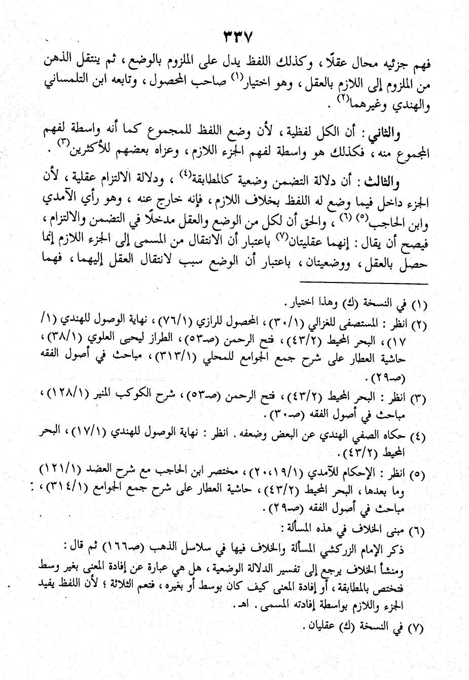 فهم جزئيه محال عقلاً، وكذلك اللفظ يدل على الملزوم بالوضع، ثمَّ ينتقل الذهن من الملزوم إلى اللازم بالعقل، وهو اختيار صاحب المحصول، وتابعه ابن التلمساني والهندي وغيرهما.